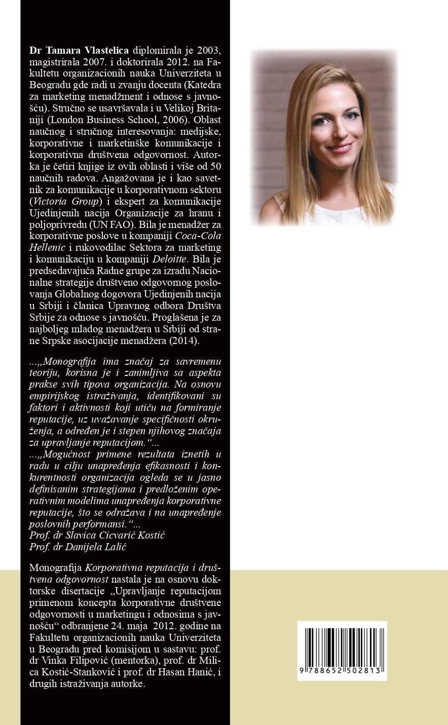 Knjiga "Korporativna reputacija i društvena odgovornost" autorke Tamare Vlastelice predstavlja savremeno, multidisciplinarno i izuzetno relevantno delo koje istražuje kompleksnu vezu između percepcije javnosti o jednom preduzeću i njegovog angažmana u domenu društveno odgovornog poslovanja. U vremenu kada potrošači, investitori, mediji i šira zajednica sve više vrednuju etičnost, transparentnost i doprinos kompanija društvenom i ekološkom blagostanju, ova knjiga donosi detaljnu analizu mehanizama kroz koje se gradi, održava i menadžeriše korporativna reputacija, kao i uloge koju društvena odgovornost igra u tom procesu.