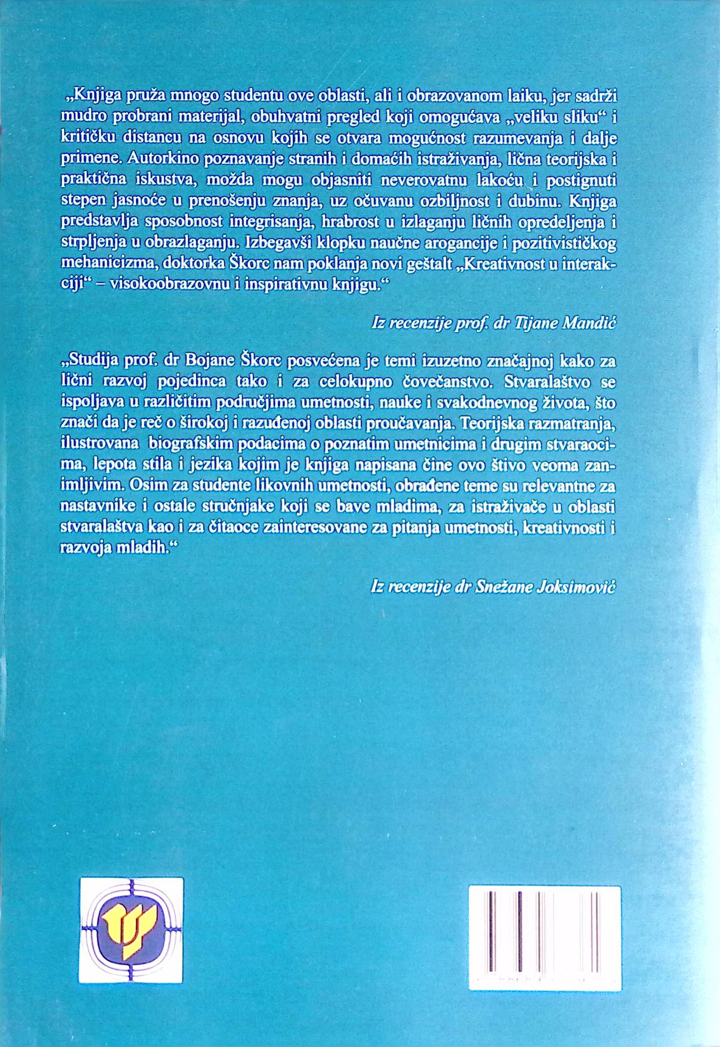 „Knjiga pruža mnogo studentu ove oblasti, ali i obrazovanom laiku, jer sadrži mudro probrani materijal, obuhvatni pregled koji omogućava „veliku sliku“ i kritičku distancu na osnovu kojih se otvara mogućnost razumevanja i dalje primene. Autorkino poznavanje stranih i domaćih istraživanja, lična teorijska i praktična iskustva, možda mogu objasniti neverovatnu lakoću i postignuti stepen jasnoće u prenošenju znanja, uz očuvanu ozbiljnost i dubinu. Knjiga predstavlja sposobnost integrisanja, hrabrost u izlaganju ličnih opredeljenja i strpljenja u obrazlaganju. Izbegavši klopku naučne arogancije i pozitivističkog mehanicizma, doktorka Škorc nam poklanja novi geštalt „Kreativnost u interakciji“ – visokoobrazovnu i inspirativnu knjigu.“