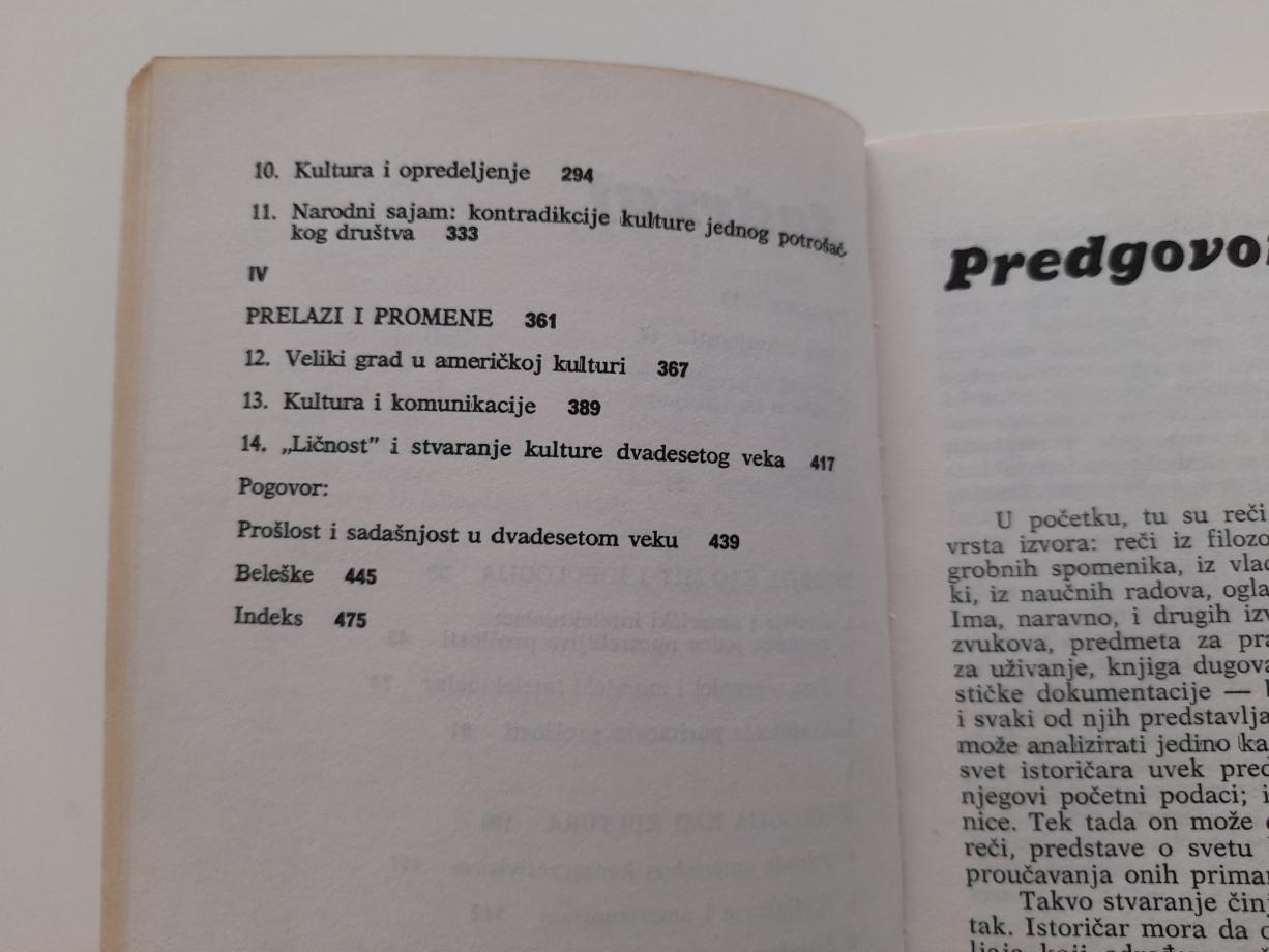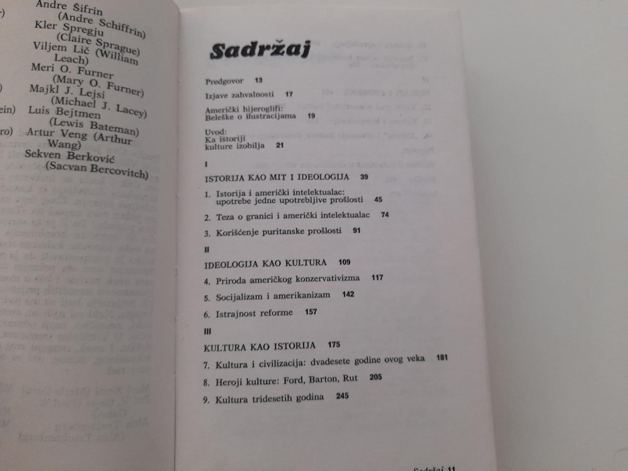 Ka istoriji kulture izobilja, Istorija kao mit i ideologija, Istorija i američki inelektualac, Teza o granici i američki intelektualac, Puritanska prošlost, Ideologija kao kultura, Američki konzervativizam, Socijalizam i amerikanizam, Kultura kao istorija, Heroji kulture: Ford, Barton, Rut, Veliki grad u američkoj kulturi, Komunikacije, Ličnost...