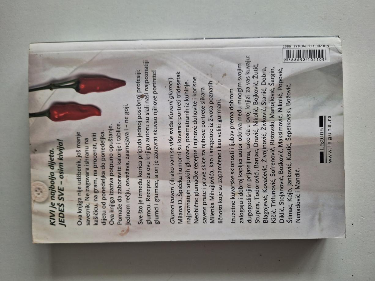 Kivi je najbolja dijeta. Jedeš sve – osim kivija! Ova knjiga nije udžbenik, još manje savetnik. Ne zagovara ishranu na kašičicu, na gram, na procenat, niti dijetu od ponedeljka do ponedeljka. Ova knjiga izaziva potpuno opuštanje. Pomaže da zaboravite kalorije i tablice. Jednom rečju, osvežava, zasmejava i – ne goji. Sve što je između korica pripada jednoj posebnoj profesiji: glumcu. Recepte za ovu knjigu autoru su slali naši najpoznatiji glumci i glumice, a on je zauzvrat skuvao njihove portrete! Izuzetne kuvarske sklonosti i ljubav prema dobrom zalogaju i dobroj kapljici autor otkriva među mnogim svojim dugogodišnjim prijateljima, tako da u ovoj knjizi za vas kuvaju: Stupica, Todorovići, Banjac, Dravić, Nikolić, Bojković, Žutić, Blagojević, Kovačević, Živojinović, Živković, Stanić, Dobra, Kičić, Trifunović, Sofrenović, Ristovski, Manojlović, Šargin, Diklić, Stojanović, Bošković, Maksimović, Nikolić, Popović, Štimac, Kojo, Janković, Kostić, Šepetkovski, Božović, Nenadović i Mandić.