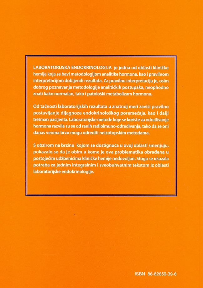 Knjiga „Laboratorijska endokrinologija” autorke Marine Stojanov predstavlja sveobuhvatan i detaljan priručnik posvećen laboratorijskim analizama u oblasti endokrinologije, jedne od ključnih grana medicine koja se bavi funkcijom i poremećajima endokrinih žlezda. Namenjena kako studentima medicine i farmacije, tako i lekarima, biohemičarima i istraživačima, ova knjiga nudi sistematski pregled biohemijskih metoda i dijagnostičkih procedura koje omogućavaju preciznu evaluaciju hormonalnih disbalansa i endokrinih oboljenja.