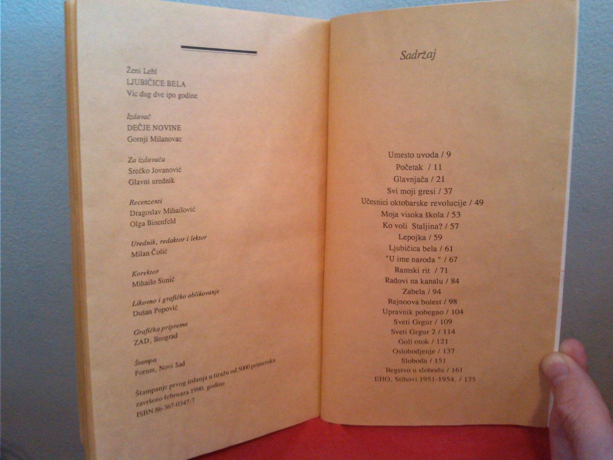 – Ustanovilo se da je u jugo-gulagu bilo veoma malo, u stvari najmanje, stvarnih narodnih neprijatelja, informbirovaca, Staljinovih obožavalaca. “ Prijatelj” bi bacio oko na nečiju suprugu, opanjkao ga da je narodni neprijatelj, poslao ga na Goli, a onda mu podneo da potpiše razvod braka, jer tobože žena nije htela muža izdajicu – navodi Ženi Lebl. Ženi je na Golom otoku bila sve do 1951. Nakon pomilovanja zbog “ vica dugog dve i po godine” nigde nije mogla da se zaposli. Tražila je novo državljanstvo i uskoro zauvek otišla u novoformiranu državu Izrael. Na podsticaj Danila Kiša napisala i objavila je knjigu o sudbini na Golom otoku u knjizi “ Ljubičica bela” i još mnoštvo knjiga o stradanjima Jevreja na balkanskim prostorima.