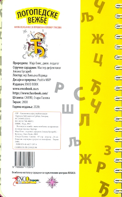 "Ako vaše dete teško izgovara glasove S, Z, C, Đ, Č, DŽ, Š ,L, R ili LJ, ova vežbanka je idealna za njega. Vežbanka je namenjena i vama, roditeljima, da bi vam pomogla da lako uz igru uvežbavate izgovor problematičnih glasova koje vaše dete teže usvaja. Format ove naše vežbanke je praktičan i možete da je nosite svuda sa sobom. Sa detetom tako možete vežbati kod kuće ili dok putujete, čekate red kod lekara, u poseti kod bake i sl. Važno je da šta više vežba i što pre savlada pravilan izgovor svih glasova. Razlozi zašto, prema poslednjim istraživanjima sve više dece ima neki od govornih poremećaja su razni. Od organskih prepreka, zubića koji još nisu izrasli pa prave probleme pri izgovoru, dete provodi previše vremena pred televizorom ili roditelji i odrasli tepaju deci, pa ona nemaju jasne i dobre primere iz okoline itd. U svakom slučaju dete mora do navršene pete godine da usvoji sve glasove i da ih izgovara pravilno. Što se duže glasovi izgovaraju nepravilno biće teže da se greške isprave. Ova vežbanka svakako nije zamena za poset logopedu koji treba dijagnostikovati problem i odrediti način vežbanja. Ona može da bude korisna Vama roditeljima kao gotov materijal jednostavnih vežbica koje će vam pomoći u uvežbavanju izgovora ’problematičnih’ glasova kod vašeg deteta. Pored vežbica za pravilan izgovor , u ovoj vežbanci pronaćićete i vežbe za jačanje govornog aparata vašeg deteta. Za sve što radimo i postižemo potrebna je vežba, tako i za pravilan izgovor.