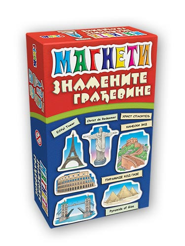 Komplet se sastoji od sedamdeset i dva magneta na kojima se nalaze znamenite građevine sveta. Nazivi građevina ispisani su na srpskom i engleskom jeziku. Ovo je savršen način da najmlađi usvoje mnoga korisna znanja o našem svetu, kao i da obogate svoj rečnik engleskog jezika.