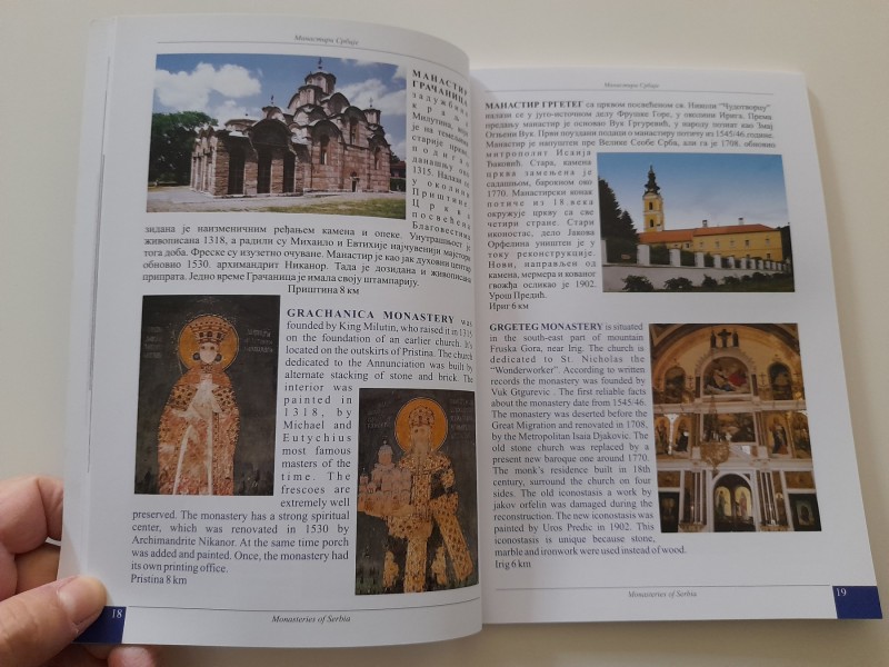 Knjiga sadrži kratak prikaz manastira na srpskom i engleskom jeziku.