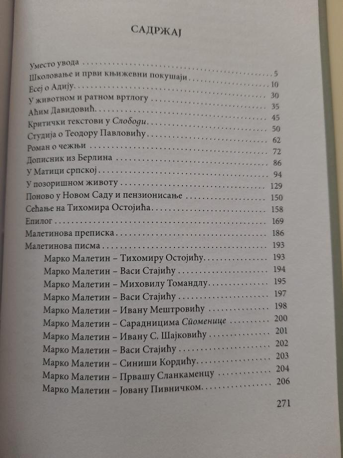Marko Maletin (1890-1968) značajan intelektualac prve polovine 20. veka, bio je nepravedno zaboravljen i pored toga što je u najtežim godinama Matice srpske bio njen sekretar, istovremeno obavljajući dužnost urednika Letopisa Matice srpske. Zahvaljujući Rajki Uljmanski, koja je u ovoj monografiji sumirala sva bitna saznanja o Marku Maletinu, intelektualcu, pripovedaču, putopiscu, memoaristi, naučniku, pedagogu, novinaru i kritičaru - budući istoričari književnosti sigurno će drugačije vrednovati njegovo delo.