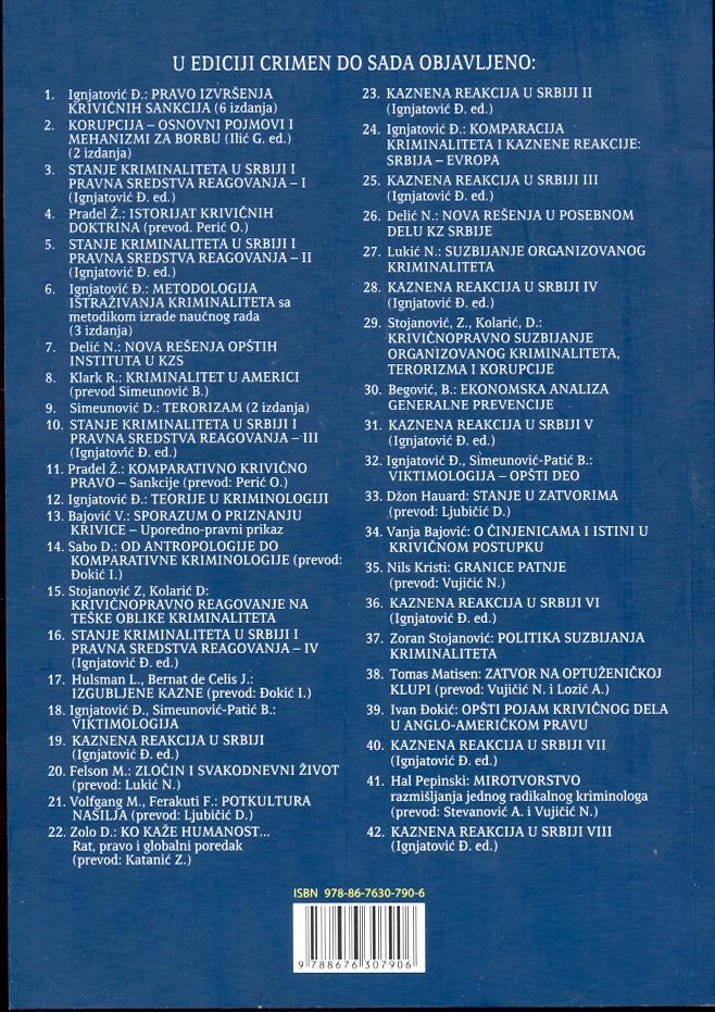 Cilj edicije je da našoj pravnoj i široj javnosti učini dostupnim monografska dela i zbornike domaćih autora koji bi se bavili pre svega stanjem i perspektivama kontrole zločina kod nas. Njeni saradnici su stručnjaci iz država u tranziciji i oni iz razvijenih zemalja čiji stavovi mogu pomoći uobličavanju racionalne, efikasne i na ljudskim pravima zasnovane politike suzbijanja i sprečavanja kriminaliteta.