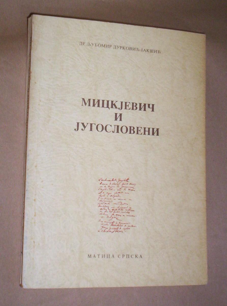 Ljubomir Durković-Jakšić: Mickjević i Jugosloveni, MS, Novi Sad, 1987, broširan povez, format 17 x 24 cm, strana 243. Dr Ljubomir Durković-Jakšić (1907-1997), srpski bogoslov i istoričar, jedan je od naših najvećih i najboljih poznavalaca srpsko-poljskih kulturnih i književnih veza, pa tako i Adama Mickjeviča i naših kulturnih poslenika od 1826. do 1865. godine. Malo korišćen primerak, gotovo kao nov, bez podvlačenja redova i čistih stranica. Ima pečat vlasnika. Ne korespondiram SMS porukama i ne šaljem knjige na Kosovo i u inostranstvo. Kupac plaća poštarinu.