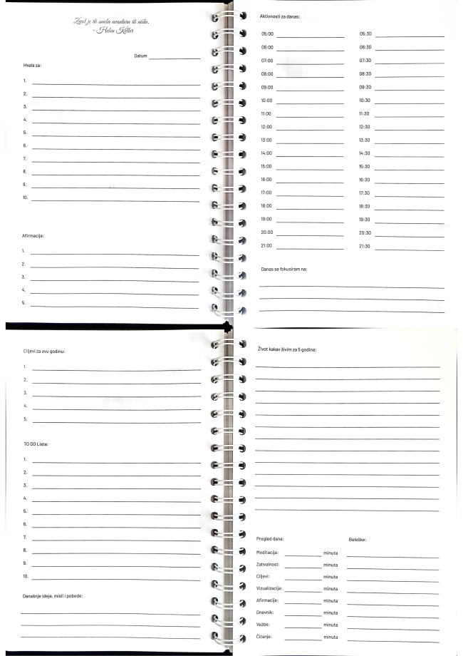Poseban akcenat stavljen je na dugoročno planiranje – uključeni su kalendari za naredne četiri godine, lista od 50 ciljeva koju sami kreirate, prostor za viziju vašeg života za pet godina, kao i konkretni planovi za dva meseca usmerenog rada na sebi. Dnevne to-do liste, afirmacije i pregledi dana omogućavaju vam da ostanete usmereni na svoje prioritete i svesno koračate ka ostvarenju svojih želja.