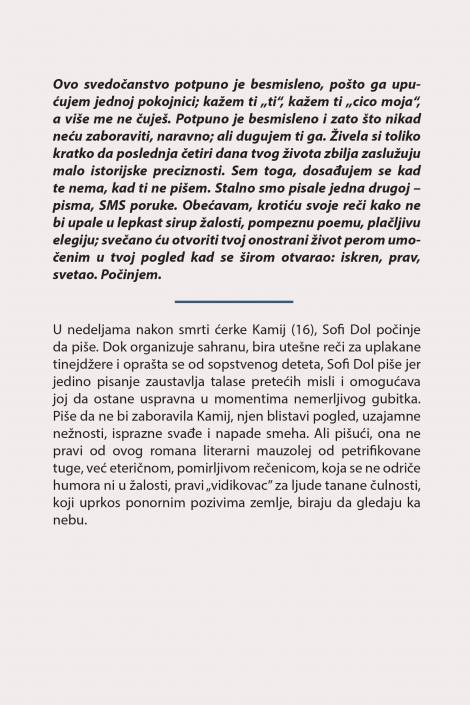 U nedeljama nakon smrti ćerke Kamij (16), Sofi Dol počinje da piše. Dok organizuje sahranu, bira utešne reči za uplakane tinejdžere i oprašta se od sopstvenog deteta, Sofi Dol piše jer jedino pisanje zaustavlja talase pretećih misli i omogućava joj da ostane uspravna u momentima nemerljivog gubitka. Piše da ne bi zaboravila Kamij, njen blistav pogled, trenutke saučesništva, ispraznih svađa i napade smeha. Ali pišući ona ne pravi od ovog romana literarni mauzolej od petrifikovane tuge, već eteričnom, pomirljivom rečenicom, koja se ne odriče humora ni u žalosti, pravi „vidikovаc” za ljude tanane čulnosti, koji uprkos ponornim pozivima zemlje, biraju da gledaju ka nebu.