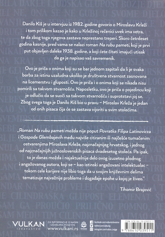 Knjiga Na rubu pameti prvi put je objavljena 1938. godine, a priča koju nam donosi je svevremena i korespondira sa današnjim vremeno, te i dalje važe reči koje je Danilo Kiš u intervjuu 1982. godine govorio o Miroslavu Krleži - da u njegovoj rečenici uvek ima vetra i da njegova zastava neprestano treperi - i treperi i do naših dana.
