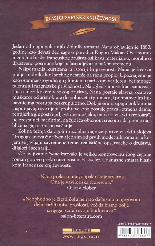 Jedan od najpopularnijih Zolinih romana Nana objavljen je 1880. godine kao deveti deo sage o porodici Rugon-Makar. Ova monumentalna freska francuskog društva oslikava materijalno, moralno i društveno posrnuće koje nalazi odjeka i u našem vremenu.