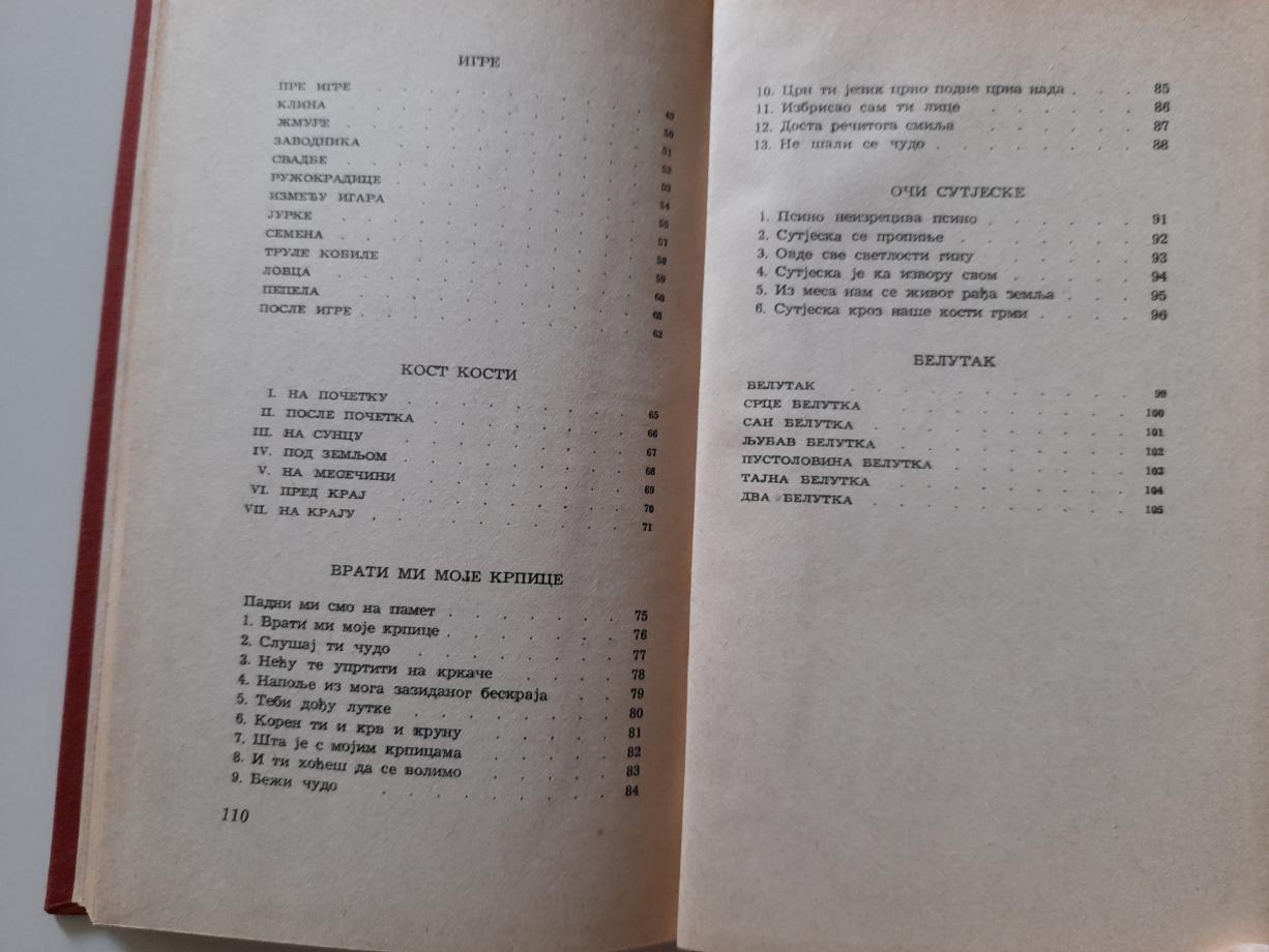 Zbirka se sastoji iz četiri pesnička ciklusa: „Igra`, „Kost kosti`, „Vrati mi moje krpice` i „Belutak`, ali suštinski predstavlja jedan neprekidni, kontrolisani, dugi dah pesničkog napora koji afirmaciju igrača koji igra do kraja pretvara u poemu o odbijanju - čistom revoltu. Folklorni lirizam, nostalgične asocijacije na detinjstvo, aktuelizacija ustaljenih fraza iz svakodnevnog govora, muzikalnost eliptičnih i lapidarnih stihova i vibrantni humor zaodevaju ovu „neslanu šalu bez šaljivca` u pobunu koja je svojevrsni egzorcizam, naslonjen na pesnikovu jezičku virtuoznost i oslonjen na magijsku funkciju jezika.