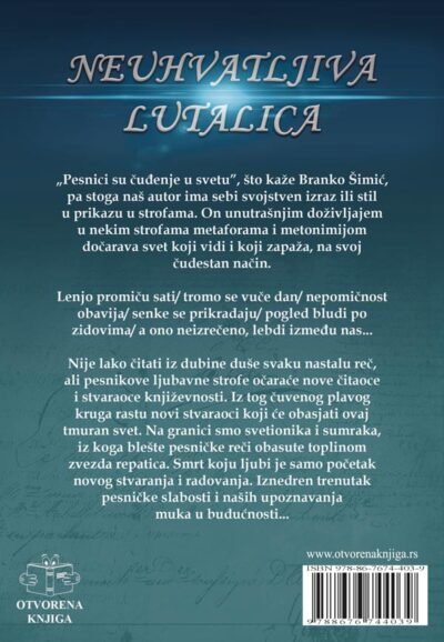 „Neuhvatljiva lutalica“ Radoslava Mandića pesnička je zbirka koja na nežan, ali izuzetno dubok i unutrašnje bogat način osvetljava prostore ljudskog postojanja, slutnje, čežnje i neizgovorenih emocija. Ovaj naslov nije slučajno odabran – on odražava samu suštinu zbirke: pesnički duh koji se ne da vezati, koji luta između stvarnog i zamišljenog, između trenutka i večnosti, između tame i svetlosti, sve vreme ostajući neuhvatljiv, a opet prisutan u svakoj strofi.