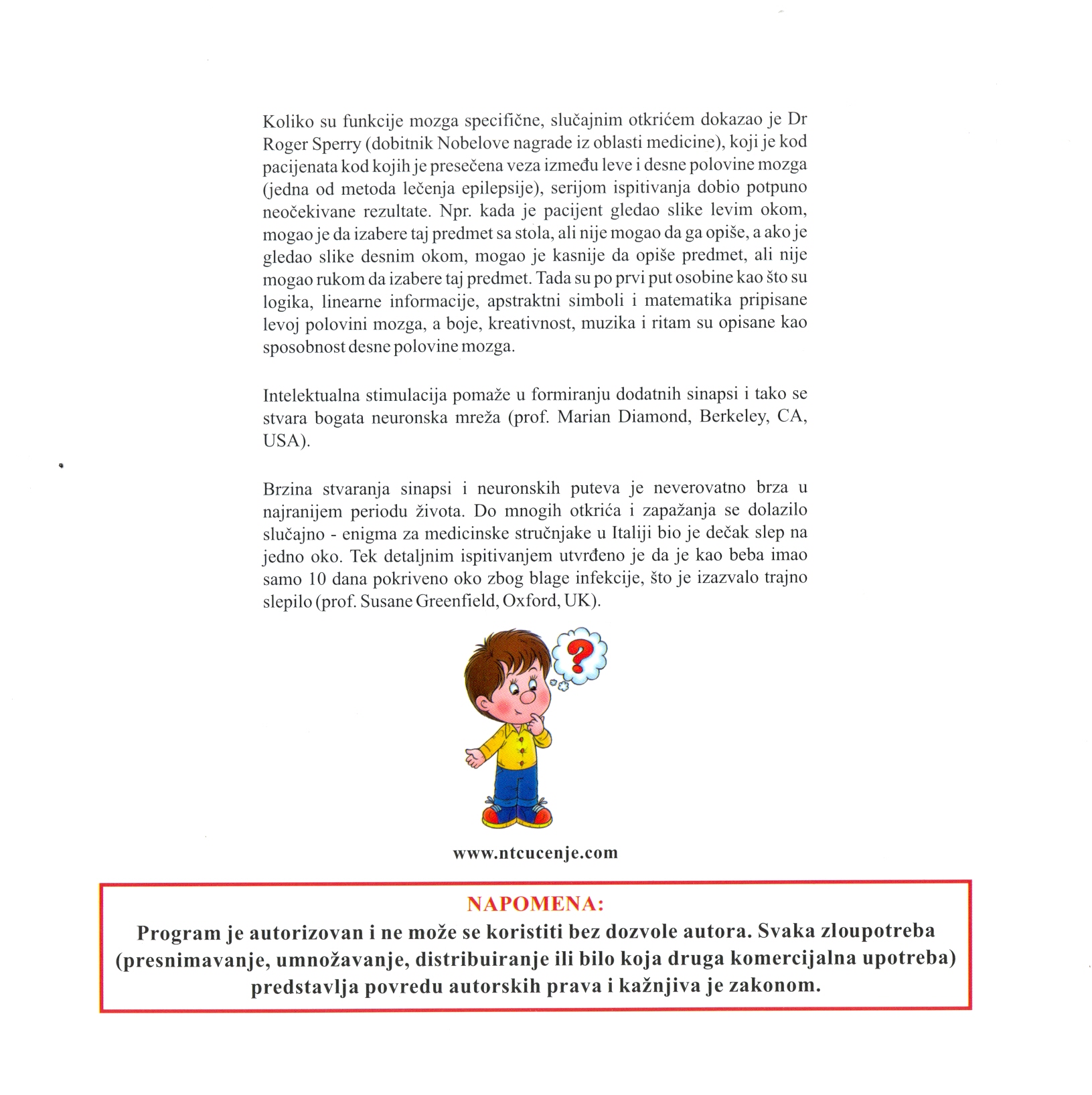 Koliko su funkcije mozga specifične, slučajnim otkrićem dokazao je Dr Roger Sperry (dobitnik Nobelove nagrade iz oblasti medicine), koji je kod pacijenata kod kojih je presečena veza između leve i desne polovine mozga (jedna od metoda lečenja epilepsijom), serijom ispitivanja dobio potpuno neočekivane rezultate. Npr. kada je pacijent gledao slike levim okom, mogao je da izabere taj predmet sa stola, ali nije mogao da ga opiše, a ako je gledao slike desnim okom, mogao je kasnije da opiše predmet, ali nije mogao rukom da izabere taj predmet. Tada su po prvi put osobine kao što su logika, linearne informacije, apstraktni simboli i matematika pripisane levoj polovini mozga, a boje, kreativnost, muzika i ritam su opisane kao sposobnost desne polovine mozga.