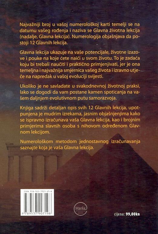 Knjiga sadrži opis svih 12 Glavnih lekcija, upotpunjena je mudrim izrekama, jasnim objašnjenjima kako da ispravno izračunate vašu Glavnu lekciju, kao i brojnim primerima slavnih osoba s njihovom određenom Glavnom lekcijom.