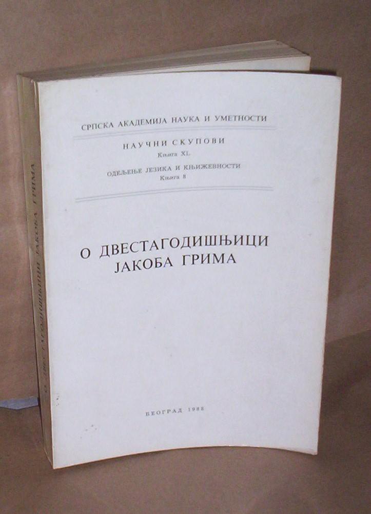 O DVESTAGODIŠNJICI JAKOBA GRIMA (Zbornik radova sa naučnog skrupa održanog od 12. do 14. novembra 1985), SANU, Naučni skupovi, knjiga XL, Odeljenje jezika i književnosti, Knjiga 8, Beograd, 1988, broširan povez, format 17 x 24 cm, strana 463 numerisanih, ilustrovano. U knjizi je predočen 41 referat autora iz SR Nemačke, DDR, Italije i jugoslovenskih republika. Na predlistovima potpis i pečat vlasnika. Stranice čiste i bez podvlačenja redova. Stranice čiste i bez podvlačenja redova. Na predlistu potpis i pečat vlasnika. Šaljem po uplati kao preporučenu tiskovinu. Ne korespondiram SMS porukama. Ne prodajem knjige kupcima sa Kosova i ne šaljem u inostranstvo. Kupac plaća poštarinu.