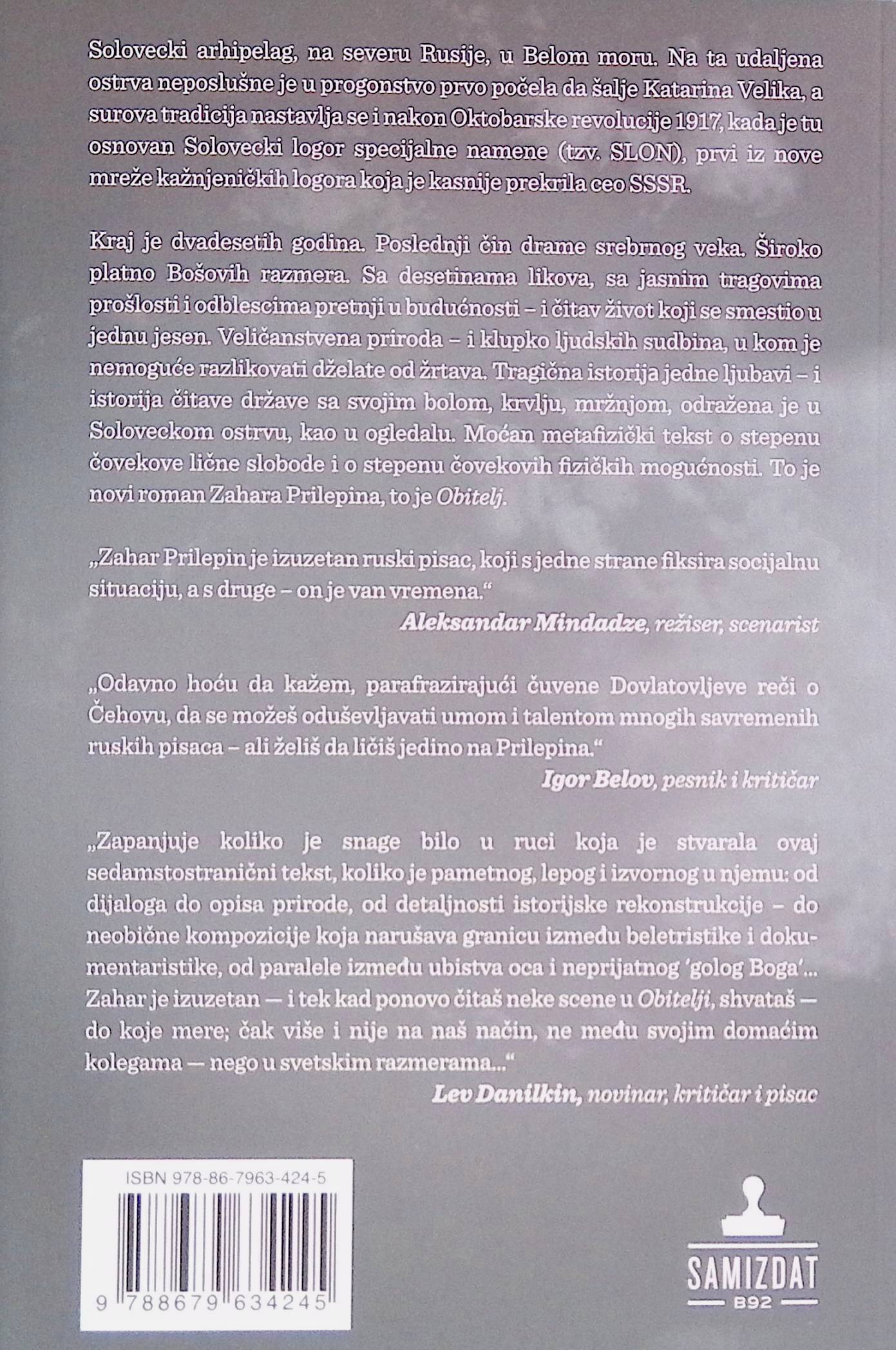 Tragična istorijа jedne ljubavi – i istorija čitave države sa svojim bolom, krvlju, mržnjom, odražena je u Soloveckom ostrvu, kao u ogledalu. Moćan metafizički tekst o stepenu čovekove lične slobode i o stepenu čovekovih fizičkih mogućnosti. To je novi roman Zahara Prilepina, to je Obitelj. Obitelj je reč slovenskog porekla, i osim što znači „porodica”, znači i manastirsko bratstvo, teritorijia manastira, svi manastirski objekti...