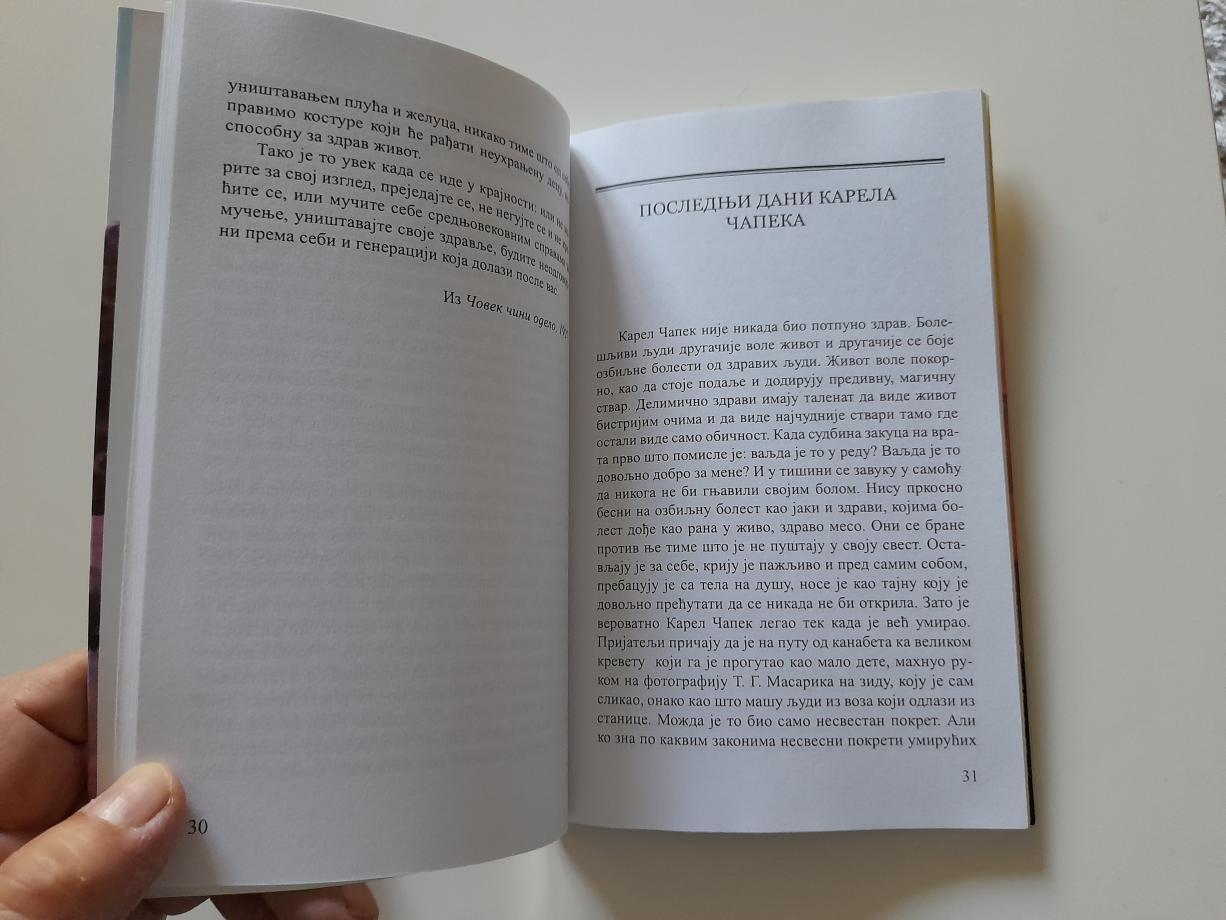 Prošlo je od tada već čitave dve nedelje i kuda god da idem, stalno u sebi govorim `pre svega`. U slobodno vreme, za vreme šetnji po prolećnom Pragu kada čoveka odjednom uhvati nemir u stanu, pa ide na brdo Petržin ili u Strahovsku baštu da očima vidi i dodirne deo Praga, i da se vrati kući miran noću, kada ne mogu da spavam, u nesuvislim razgovorima s prijateljima svuda me prate reči `pre svega`. Sada, kada sam sve to dobro primislila. izanalizirala i isprevrtala, moram, gospodine, da vam vratim vašu pohvalu. Ja jesam, naravno, Čehinja, ali PRE SVEGA se trudim da budem pristojan čovek.