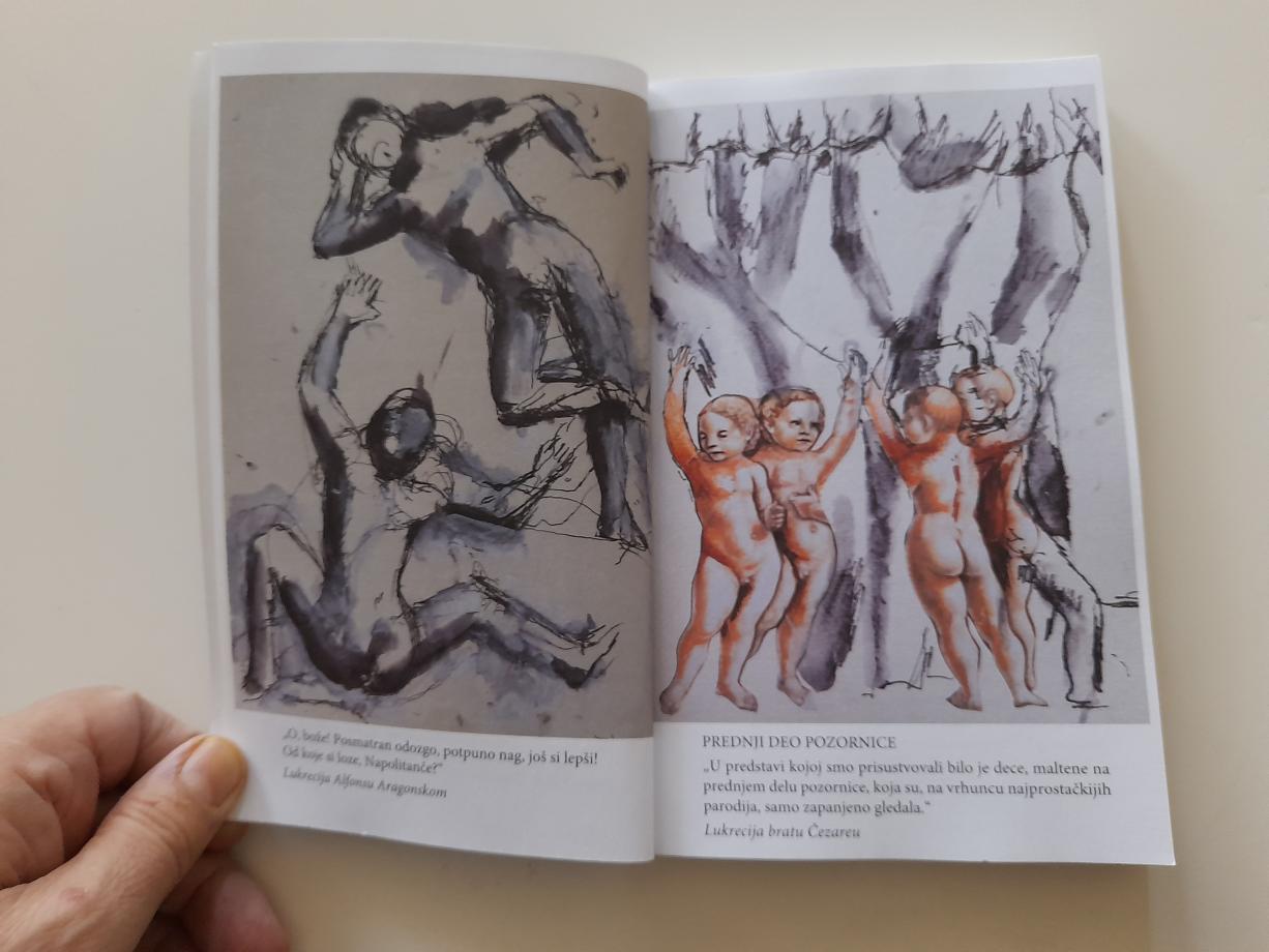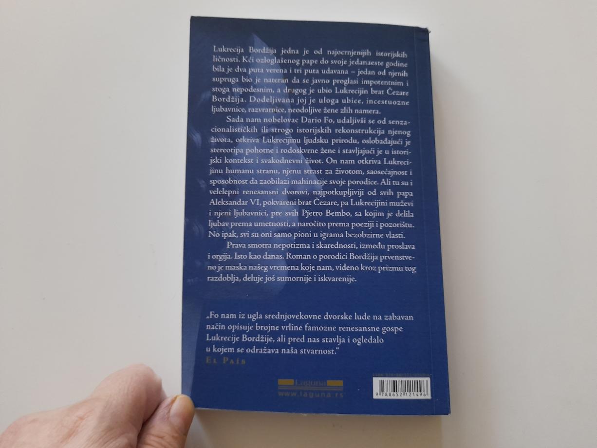 Sada nam nobelovac Dario Fo, udaljivši se od senzacionalističkih ili strogo istorijskih rekonstrukcija njenog žviota, otkriva Lukrecijinu ljudsku prirodu, oslobađajući je stereotipa pohotne i rodoskvrne žene i stavljajući je u istorijski kontekst i svakodnevni život. On nam otkriva Lukrecijinu humanu stranu, njenu strast za životom, saosećajnost i sposobnost da zaobilazi mahinacije svoje porodice. Ali tu su i velelepni renesansni dvorovi, najpotkupljiviji od svih papa Aleksandar VI, pokvareni brat Čezare, pa Lukrecijini muževi i njeni ljubavnici, pre svih Pjetro Bembo, sa kojim je delila ljubav prema umetnosti, a naročito prema poeziji i pozorištu. No ipak, svi su oni samo pioni u igrama bezobzirne vlasti.