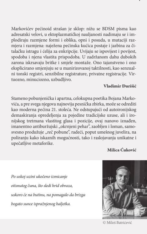 Zbirka poezije „Pećina, iznutra“ Bojana Markovića predstavlja snažno, smelo i višeslojno pesničko delo koje čitaoca uvodi u uznemirujući, sugestivan i hermetičan svet unutrašnjih prostora, telesnosti, identiteta i jezika. Ova knjiga nije samo zbirka pesama, već poetski organizam u kojem se prepliću ispovest i istorija, mit i savremenost, erotika i filozofija, pobuna i introspekcija. Markovićev „pećinoid“ prostor funkcioniše kao simbolička jazbina i utočište, ali i kao mračni laboratorij u kojem se ispituju granice izraza, percepcije i samog pesničkog čina.