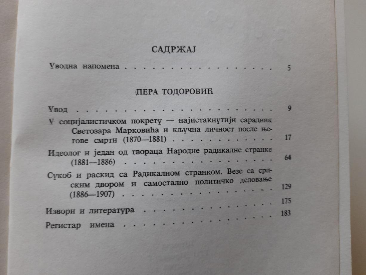 Pera Todorović je jedan od osnivača i prvaka Narodne radikalne stranke. Todorović takođe spada i među najistaknutije pojave srpskog novinarstva uopšte. Bio je blizak vođi srpskih socijalista Svetozaru Markoviću i uređivao je niz listova i časopisa, pa i socijalistički list `Rad`. Pokretač je listova `Samouprava` i `Radikal`, a od 1889. do 1903. izdavao je `Male novine`, prvi informativno-senzacionalistički list u Srbiji. Bio je dobrovoljac u Srpsko-turskom ratu 1876. a po njegovom završetku 1878. emigrirao je u Ugarsku i u Novom Sadu je 1878. i 1879. s Lazom Pačuom izdavao socijalistički list `Straža`. Potom odlazi u Francusku, a po povratku u Srbiju osuđen je na smrt zbog Timočke bune koju su 1883. u zaječarskom kraju podigli radikali, ali je pomilovan. Nakon izmirenja s Kraljem Milanom zalagao se za sporazum Radikala i Naprednjaka, zbog čega je isključen iz stranke. U književnosti se najviše bavio istorijskim temama i prevodio je Černiševskog. Dela: `Dnevnik jednog dobrovoljca`, `Silazak s prestola`, `Karađorđe`.