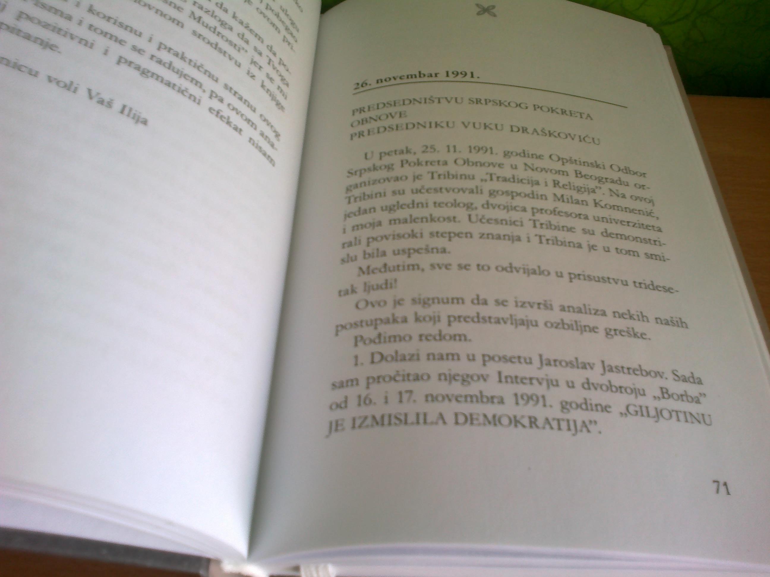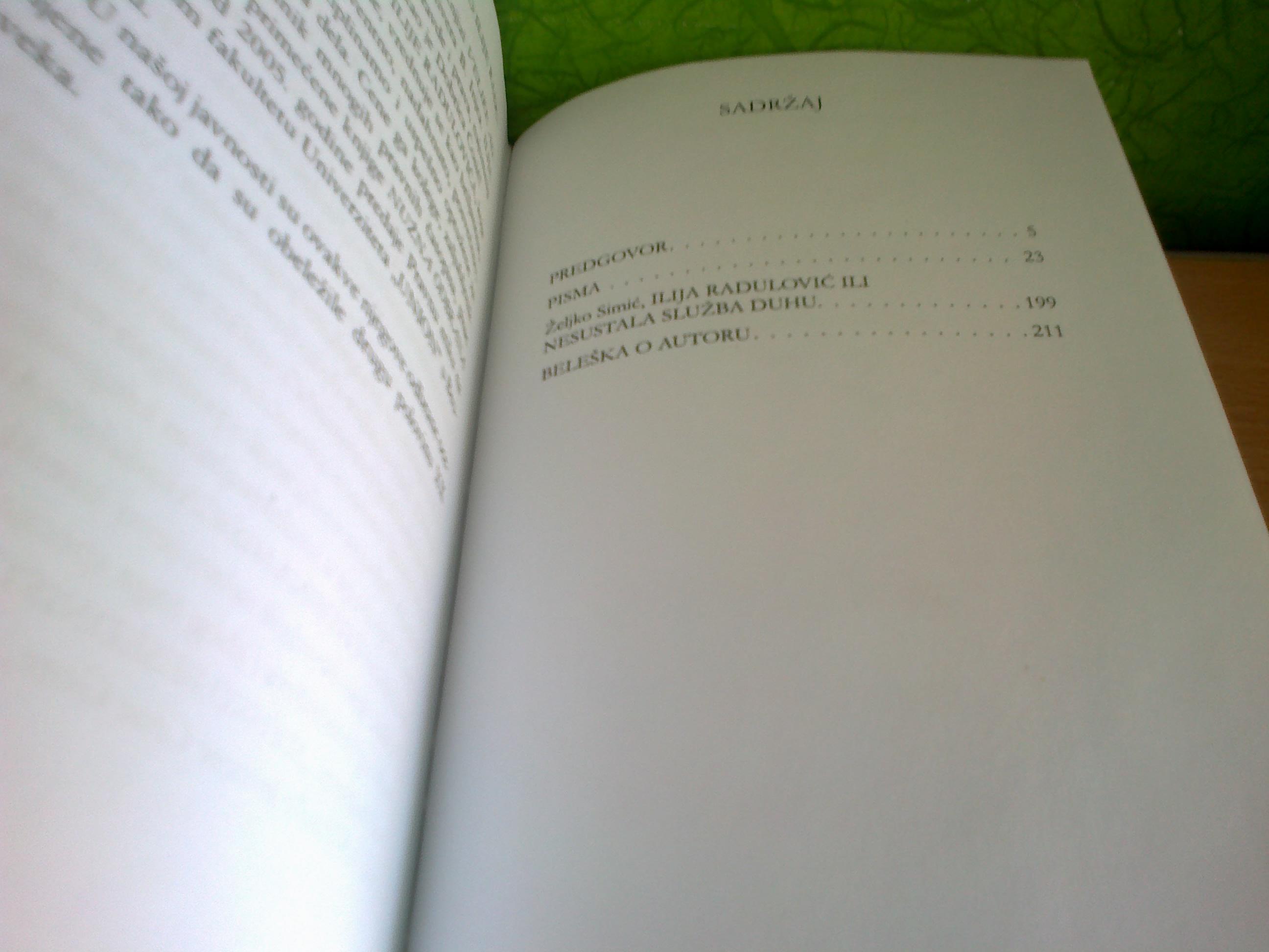 Knjiga koja se nalazi pred čitaocima, a koju je pisao jedan od najuglednijih jugoslovenskih i srpskih advokata i najobrazovanijih javnih delatnika, Ilija Radulović, ne samo da je višestruko intelektualno podsticajna i provokativna nego je i mnogoznačna, polifona i obremenjena onim pitanjima koja sežu u samu srž naše, ljudske „duhovne situacije vremena“ u koju smo „bačeni“ nepitani. Protivno očekivanjima koja mogu proisteći iz letimičnog pogleda na sam naziv ovog silovitog i razuđenog spisa, ali čak i iz prodornijeg čitanja njegove sadržine, ova „epistolarna proza“ nije lična (premda ima i svog adresanta, i svog adresata!): ona je upućena svim mislećim bićima koja su u „potrazi za iščezlom logosnom punoćom“ individualnog i kolektivnog života u zamršenim okolnostima globalističkog nasilja…