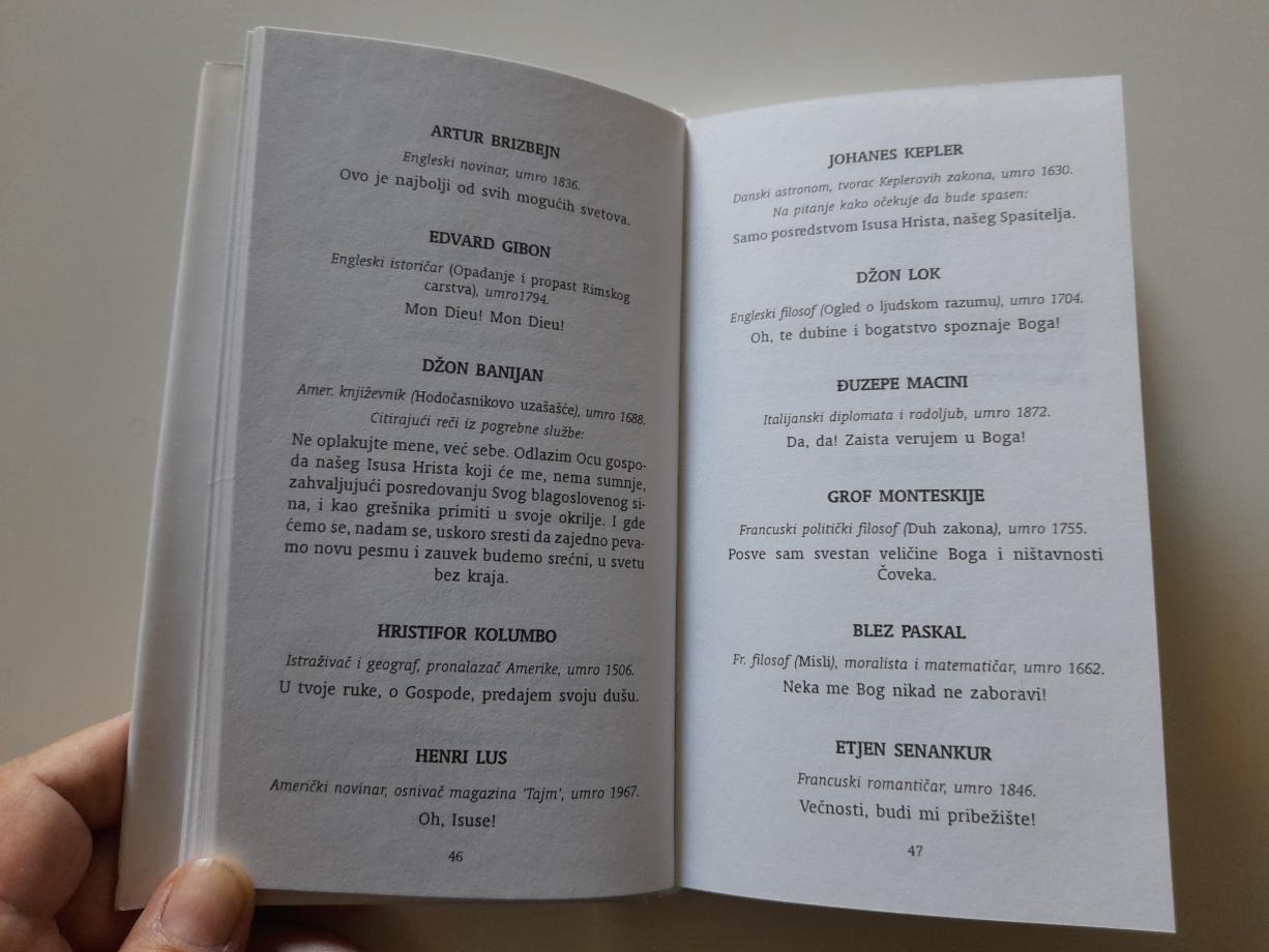 Izuzetna i krajnje neobična knjiga u kojoj su sabrane reči što su ih pred smrt izgovarali znameniti ljudi raznih vremena. Knjiga koja upečatljivo svedoči o sudbinskom odnosu ljudi prema životu i smrti.