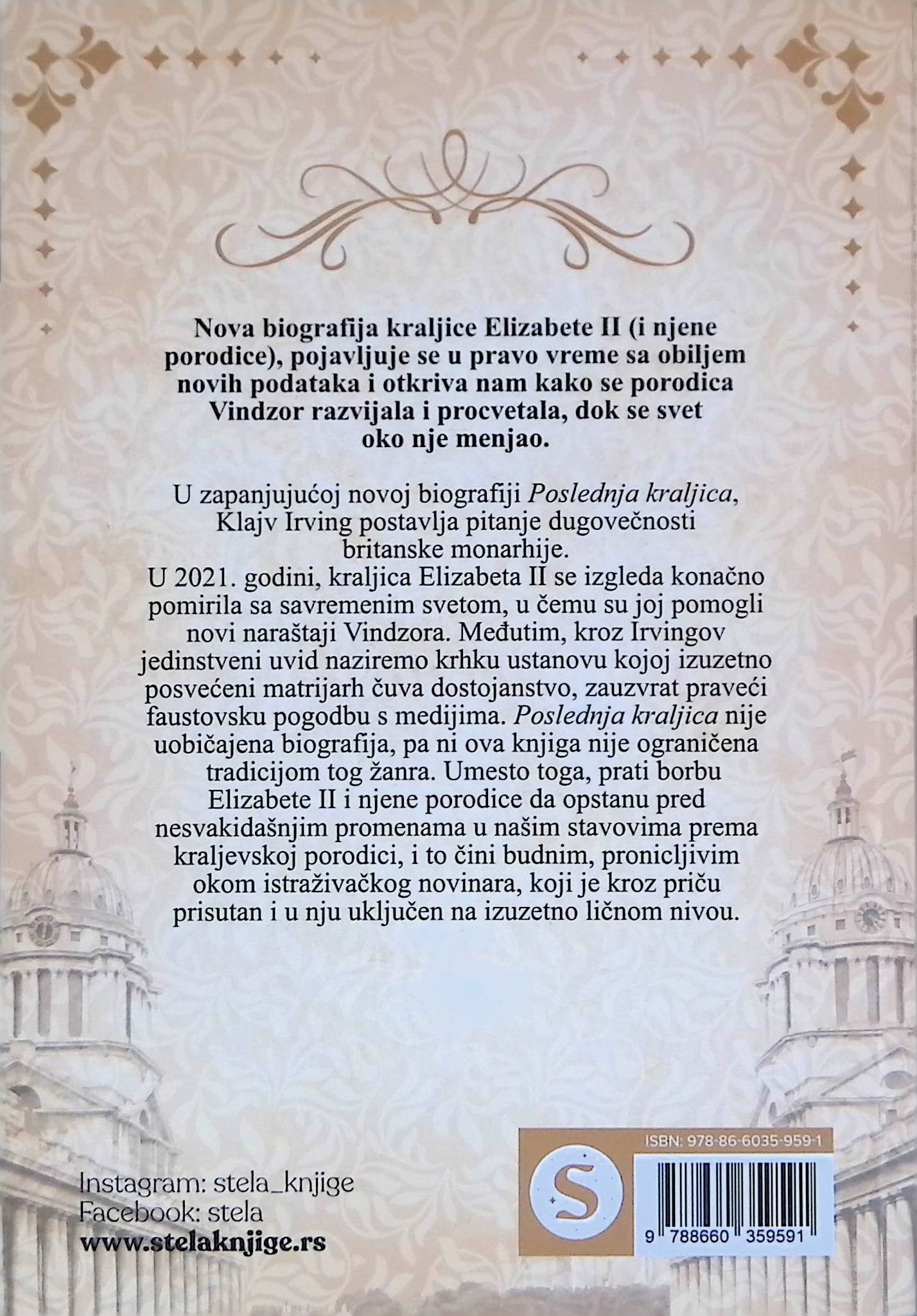 U zapanjujućoj novoj biografiji Poslednja kraljica, Klajv Irving postavlja pitanje dugovečnosti britanske monarhije. U 2021. godini, kraljica Elizabeta II se izgleda konačno pomirila sa savremenim svetom, u čemu su joj pomogli novi naraštaji Vindzora. Međutim, kroz Irvingov jedinstveni uvid naziremo krhku ustanovu kojoj izuzetno posvećeni matrijarh čuva dostojanstvo, zauzvrat praveći faustovsku pogodbu s medijima.