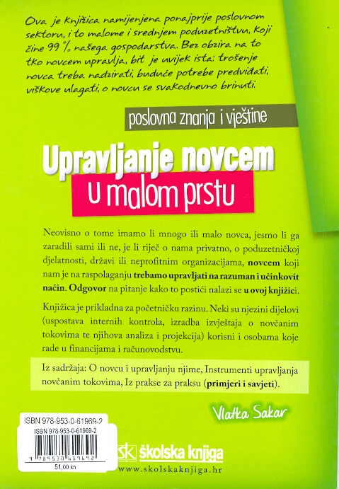 Neovisno o tome imamo li mnogo ili malo novca, jesmo li ga zaradili sami ili ne, je li riječ o nama privatno, o poduzetničkoj djelatnosti, državi ili neprofitnim organizacijama, novcem koji nam je na raspolaganju trebamo upravljati na razuman i učinkovit način. Odgovor na pitanje kako to postići nalazi se u ovoj knjižici.