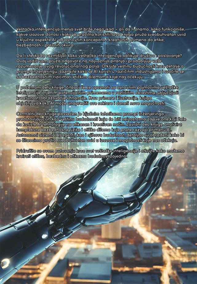 Dobrodošli u knjigu koja se bavi jednom od najrevolucionarnijih tehnologija našeg doba – veštačkom inteligencijom (AI). Sa svojim neverovatnim potencijalom, AI menja način na koji živimo, radimo i razmišljamo, dok istovremeno postavlja nove izazove i pitanja. Ova knjiga ima za cilj da vam pruži sveobuhvatan uvid u raznolike aspekte veštačke inteligencije, od njenih osnova do najnovijih tehnoloških dostignuća, praktičnih primena, etičkih dilema i budućih mogućnosti.