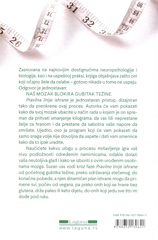 Naučićete kakvu ulogu u procesu mršavljenja igra vaš nivo podložnosti određenim namirnicama, odakle dolazi vaša neutoljiva glad i kako se izboriti s ovim urođenim osobinama mozga. Suzan vas vodi kroz faze Pravilne linije ishrane od početnog gubitka težine, preko održavanja stečenog, do konačne pobede, a njen dinamičan plan ishrane mogu da primene svi, počev od vegana, pa preko onih koji se hrane bez glutena, drže paleo ili keto dijetu, do onih koji jedu sve što im dođe pod ruku.