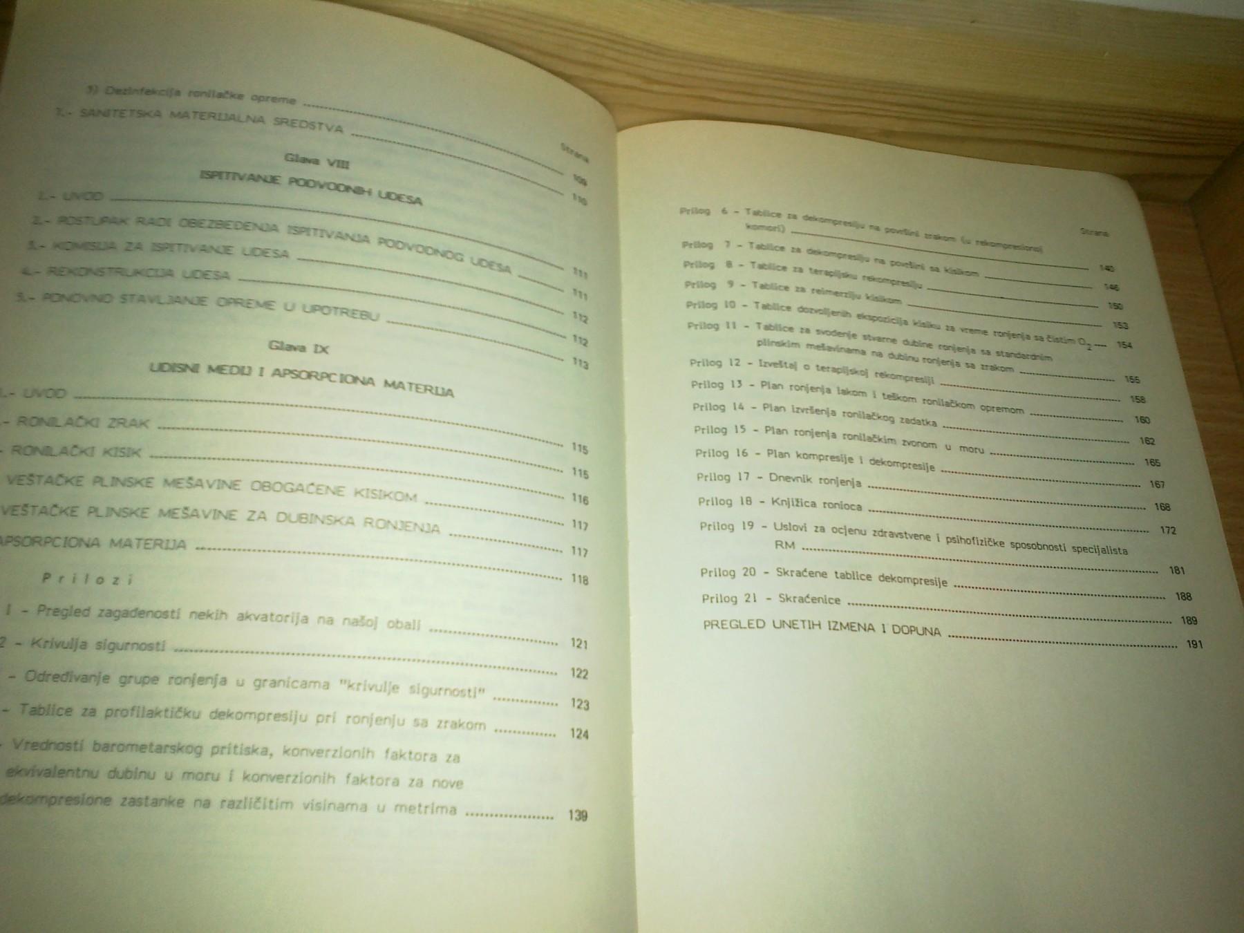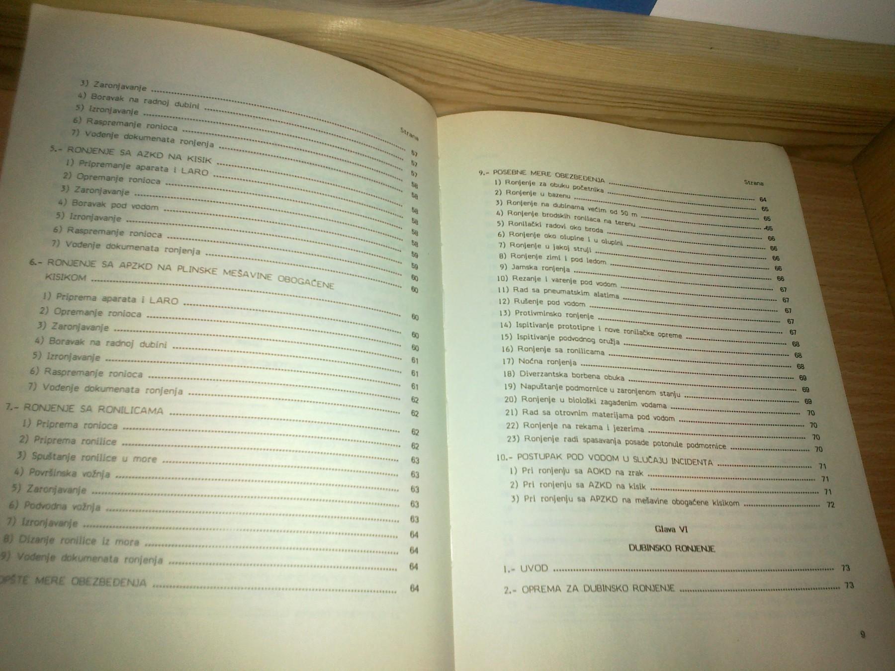 . RONILAČKA oprema. . . Ronilački brodovi. . . . rukovodilac ronjenja. . . ronjenje na dubinama većim od 50. metara. . . . . zaronjavanje. . . . priprema ronioca. . . . NOĆNA RONJENJA. . . . . Napuštanje podmornice u zaronjenjom stanju. . . . rad sa OTROVNIM materijama POD VODOM. . . . Pri ronjenju sa AOKD na zrak. . . . sa AZKD na kisik. . . . Ronjenje oko olupine i u olupini. . . . HIDROSTATSKO ronjenje. . . LEKARSKI pregledi. . . . . povrede i oboljenja. . . . higijena ronjenja. . . ispitivanje podvodnih udesa. . . . veštačke plinske mešavine za dubinska ronjenja. . . . dnevnik, knjižica ronjenja. . . krivulja sigurnosti. . . GENERALŠTAB oružanih snaga SFRJ, Udžbenički format. . .193. strane. . . SPLIT,1989. god ➡️ ➡️ ...➡️