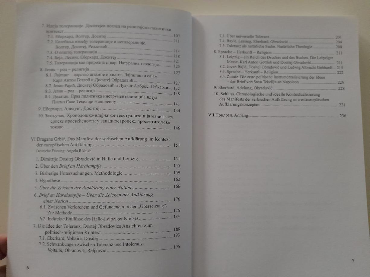 Knjiga Dragane Grbić PREKRETANjA. Hale - Lajpcig, prekretnica u životu Dositeja Obradovića / VORENTSCHEIDUNGEN. Halle - Leipzig, Wendepunkt im Leben von Dositej Obradović donosi dve studije na srpskom i nemačkom jeziku u kojima se analizira Pismo Haralampiju Dositeja Obradovića u kontekstu zapadnoevropskog prosvetiteljstva druge polovine 18. veka. Uvodna studija sa kulturno-istorijskog aspekta osvetljava Obradovićev studijski boravak na univerzitetima u Haleu i Lajpcigu, dok druga studija sistematičnom analizom problematizuje idejne osnove koje manifest Obradovićevog prosvetiteljstva dovode u neposrednu vezu sa delima Johana Avgusta Eberharda, Voltera, Bejla, Lesinga i Karla Antona Gotloba. Prevod obe studije na nemački jezik potpisuje prof. dr Angela Rihter. Pored ovih studija, knjiga donosi i prevode dva izvorna teksta, koji predstavljaju osnovno hermeneutičko polazište problemske studije. Pismo Haralampiju Dositeja Obradovića sa srpskog na nemački prevela je Eva Kovolik, a tekst Johana Avgusta Eberharda O obeležjima prosvećenosti nacije sa nemačkog na srpski prevela je Dragana Grbić.
