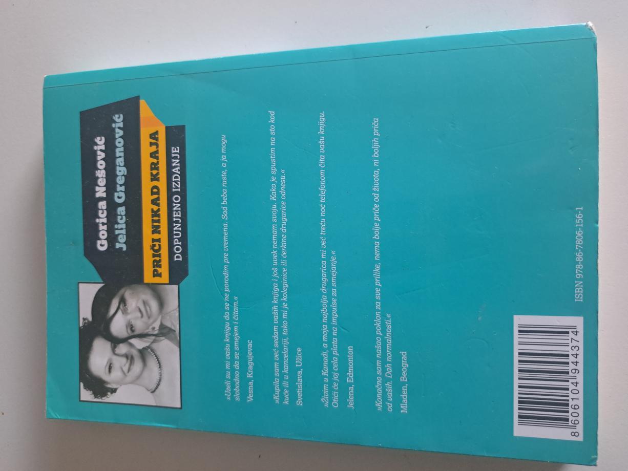 Knjiga koju ste nekad nekom pozajmili i više је nikad niste dobili nazad. „Gorica Nešović i Jelica Greganović druže se već duže od četiri decenije. Pomislite samo koliko priča može da stane u to vreme, od devojaštva u gimnaziji, preko studiranja, izlazaka, rada u medijima, momaka, supruga, venčanja i razvoda, do dece, а bogami i unučića. Ovo је knjiga koja ne beleži samo događaje i vreme već predstavlja i jedinstvenu istoriju jednog ženskog prijateljstva. Sve ove priče su one jedna drugoj ispričale, а onda su ih podelile sa čitaocima. Zato је priča koja se krije iza svih ovih ona najvažnija, večita, retko ispričana priča о prijateljstvu, о drugarici sa kojom možeš da podeliš sve lepe i teške trenutke koje život donosi. А u ovoj naizgled kolokvijalnoj frazi dve ovdašnje genijalne prijateljice otkrivena је velika istina: priči nikad kraja...“