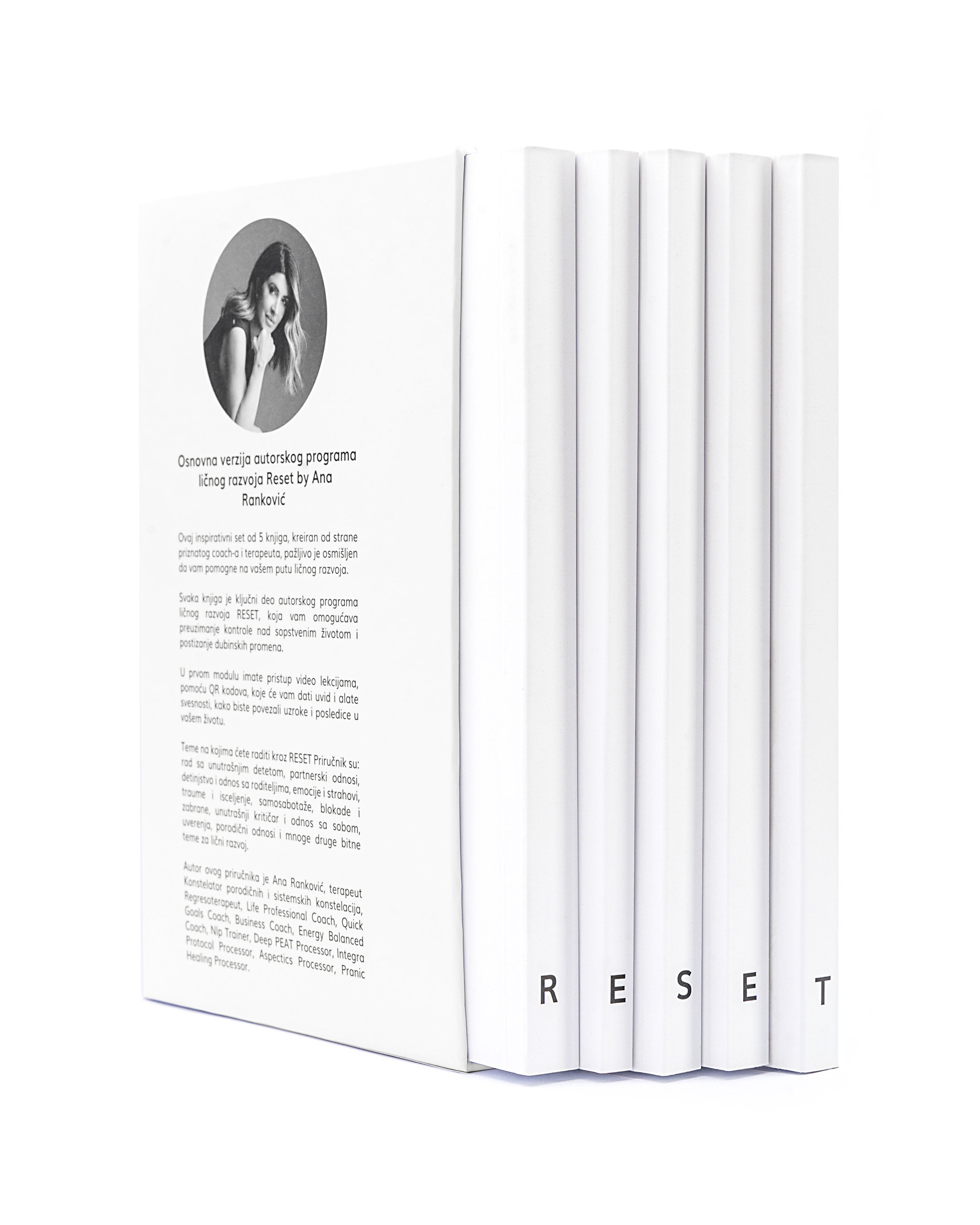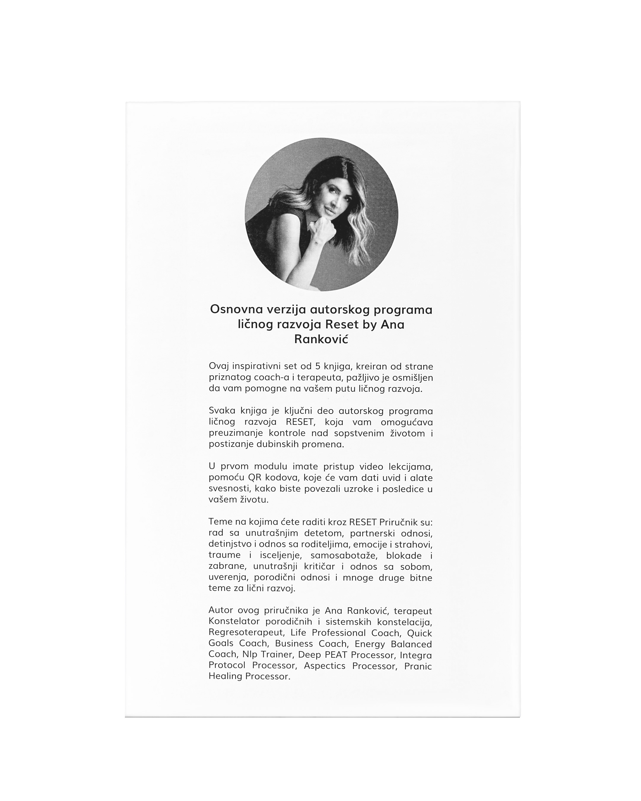 Priručnik Reset, komplet pet knjiga autora Ane Ranković predstavlja sveobuhvatan vodič kroz program ličnog razvoja RESET, dizajniran da osnaži pojedince na putu samootkrivanja i transformacije.