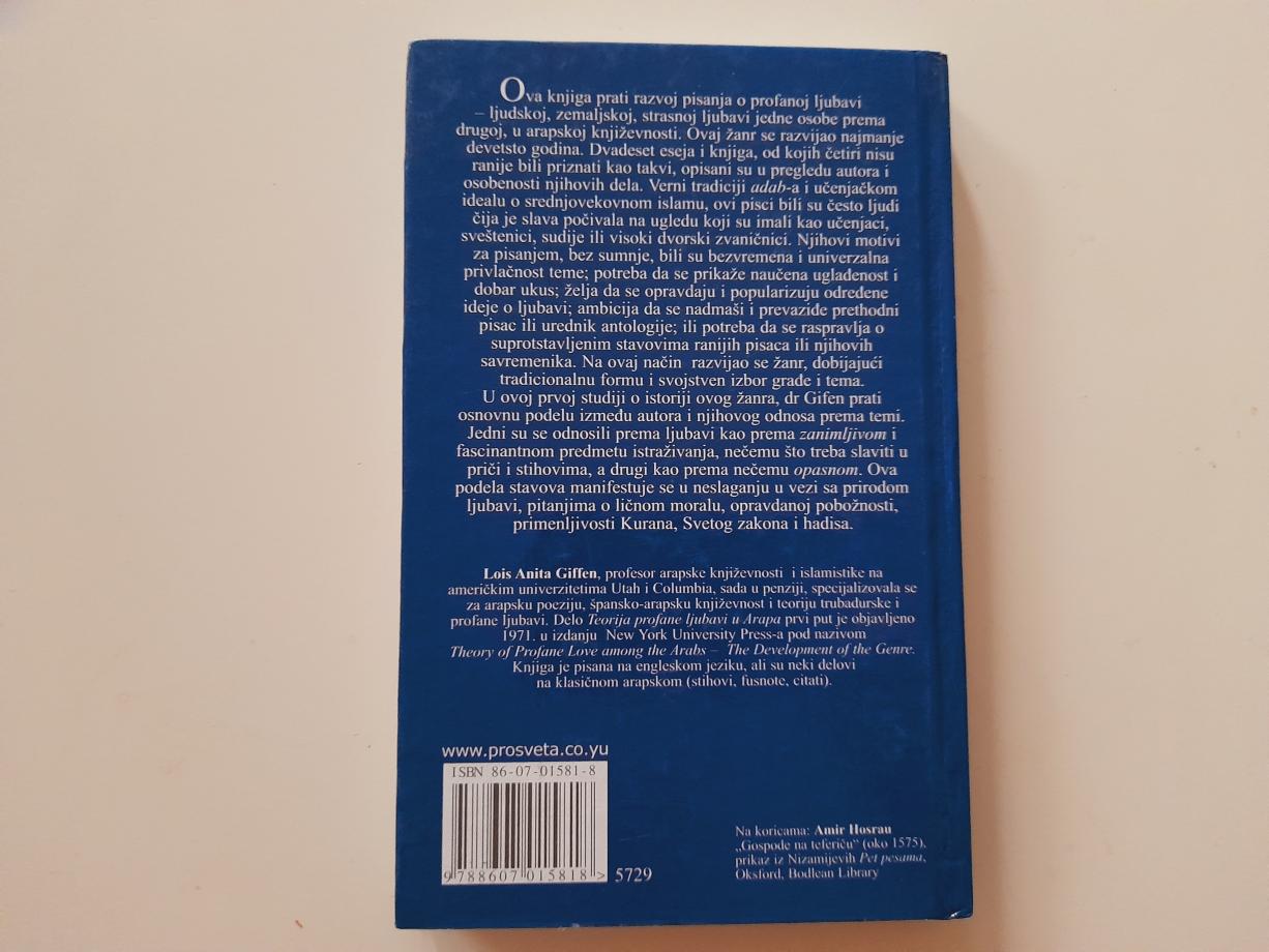 Studija Profana ljubav u Arapa delo je koje prati razvoj pisanja o profanoj ljubavi - ljudskoj, zemaljskoj, strasnoj ljubavi jedne osobe prema drugoj, u arapskoj književnosti. Ovaj žanr se razvijao najmanje devetsto godina. Lois Grifen analizira u ovoj knjizi dela pisaca čija je slava često počivala na ugledu koji su imali kao naučnici, sveštenici, sudije ili visoki dvorski zvaničnici. Njihovi motivi za pisanje bili su, nema sumnje, bezvremena i bezrezervna privlačnost ljubavi kao teme. Takođe, želeli su da pokažu i visok stepen uglađenosti i dobar ukus, želju da se pravdaju i popularizuju određene ideje o ljubavi, ambiciju da se nadmaši i prevaziđe prethodni pisac ili urednik antologije ili pisac. Na ovaj način razvijao se žanr, dobijajući tradicionalnu formu i svojstven izbor građe i tema. Neki od autora o kojima Lois Grifen govori odnose se prema ljubavi kao prema zanimljivom predmetu istraživanja koji fascinira, a drugi kao prema nečemu što treba slaviti, treći kao prema nečemu što je opasno. Profana ljubav u Arapa delo je koje o ljubavi i ljubavnom govori kao o fenomenu koji iza pojavnog oblika profanog krije brojna druga lica: mistično, sveto, uzvišeno, nepoznato, a Profana ljubav u Arapa delo je koje se može čitati i kao uvod u uzbudljivo tkanje arapske književnosti, koja čeka da bude otkrivena.
