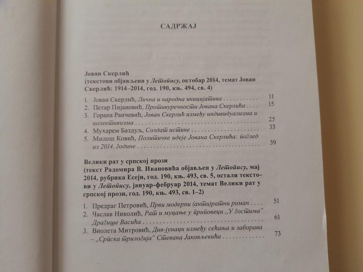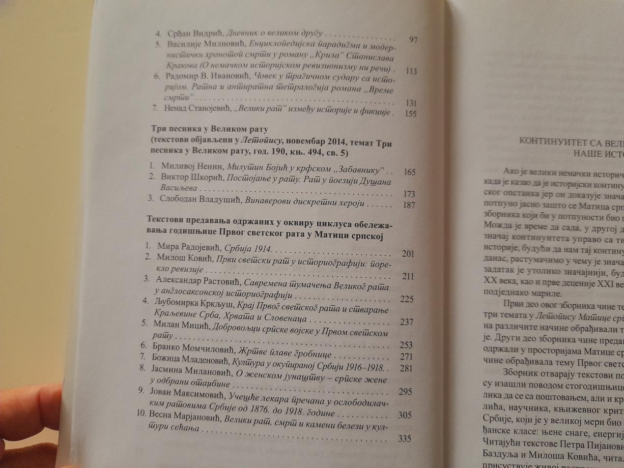 Први део зборника чине текстови који су махом настали у оквиру три темата у „ Летопису Матице српске” у току 2014. године, који су на различите начине обрађивали то велико време српске историје. Други део зборника чине предавања који су угледни историчари одржали у просторијама Матице српске, а која су на различите начине обрађивала тему Првог светског рата.