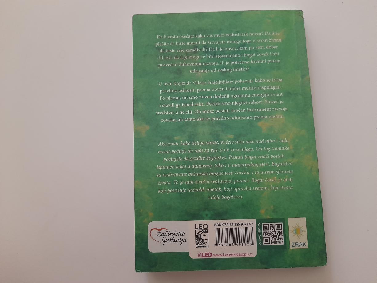 U ovoj knjizi dr Valerij Sinjeljnjikov pokazuje kako se treba pravilno odnositi prema novcu i njime mudro raspolagati. Po njemu, mi smo novcu dodelili ogromnu energiju i vlast i stavili ga iznad sebe. Postali smo njegovi robovi. Novac je sredstvo, a ne cilj. On može postati moćan instrument razvoja čoveka, ali samo ako se pravilno odnosimo prema njemu.