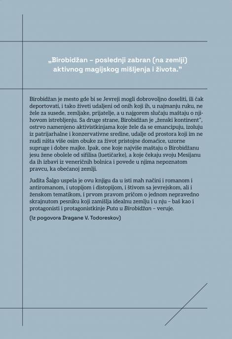Put u Birobidžan Judite Šalgo istražuje koncept Birobidžana kao mesta za dobrovoljno naseljavanje ili čak deportaciju Jevreja, pružajući im udaljenost od onih koji ih ne žele za susede.
