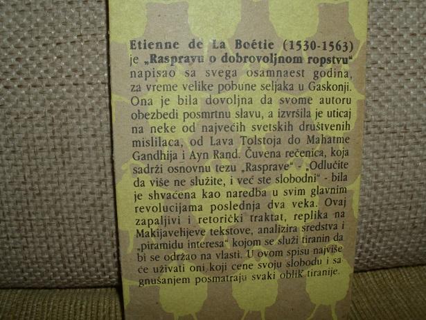 Knjiga je napisana još u XVI veku u vreme velike pobune seljaka u Gaskonji (Francuska), a izvršila je uticaj na svetske društvene mislioce od Lava Tolstoja do Mahatme Gandija i Ayn Rand. Čuvena rečenica iz knjige „Odlučite da više ne služite i već ste slobodni” bila je shvaćena kao naredba u svim glavnim revolucijama u poslednja dva veka.