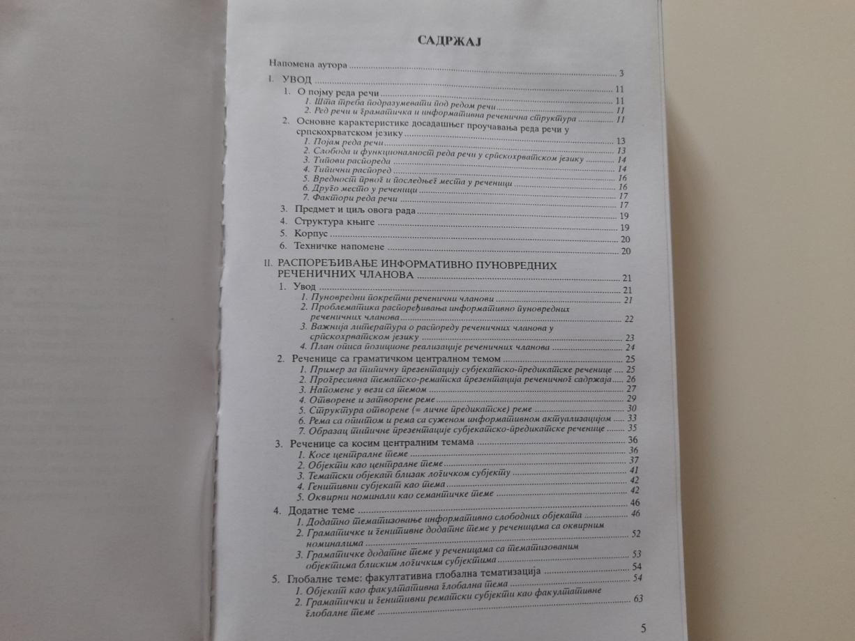 Popović pokazuje da reči u rečenici ne stoje nasumično, već da njihov položaj menja smisao i naglašava ono što govornik želi da istakne. Knjiga obuhvata: