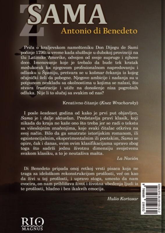 Sama od Antonija di Benedetoa je fascinantna priča koja se odvija u 1790. godini, u dubokoj provinciji Latinske Amerike. Glavni junak, Don Dijego de Sami, je kraljevski nameštenik koji se našao u neobičnoj situaciji. On je odvojen od svoje porodice, a njegovo imenovanje, koje je trebalo da bude kratkotrajno pre nego što napreduje u karijeri i preseli se u Španiju, pretvara se u dugotrajni košmar čekanja. Ovaj period čekanja je pun frustracija i pogrešnih odluka, koje su uzrokovane neskladom između njegovih ambicija i stvarnosti koja ga okružuje. Roman istražuje teme ambicije, očajanja, i posledica donošenja pogrešnih odluka, što ga čini relevantnim i današnjem čitaocu, postavljajući pitanje: Nije li to slučaj sa svakim od nas?