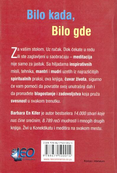 Barbara En Kifer je autor bestselera 14.000 stvari koje nas čine srećnim, 8.789 reči mudrosti i mnogih drugih knjiga, živi u Konektikatu, meditira na svakom mestu i u ovoj knjizi sakupila je 3.299 mantri, saveta, citata i koana za mir i spokoj.