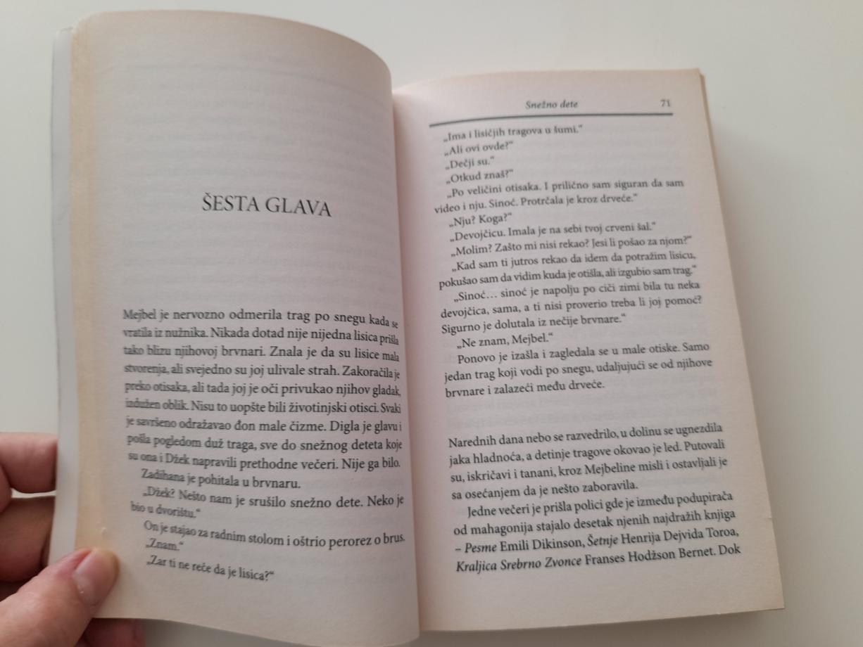 A onda će se na njihovom pragu pojaviti devojčica koja sebe naziva Faina. Mala i beloputa, ona izgleda kao da je nastala čarolijom: ide u lov u pratnji crvene lisice, za sobom ostavlja vihore vejavice, nekako uspeva da preživi potpuno sama u surovoj divljini Aljaske. Dok se bore da je razumeju, Džek i Mejbel će zavoleti Fainu kao rođeno dete. No u tom divnom, bezdušnom kraju često nije sve onako kao što izgleda, a ono što će njih dvoje s vremenom saznati o Faini sve će ih preobraziti…
