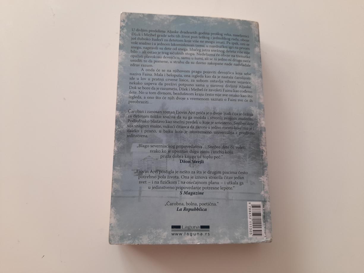 Čaroban i zanosan roman Ejovin Ajvi priča je o dvoje ljudi čija je čežnja za detetom toliko snažna da su ga možda i stvorili svojom maštom. Podjednako blistavo kao snežni predeli u koje je smešteno, Snežno dete sija snagom mašte, vukući čitaoca da zaroni u jedno mesto koje mu je i daleko i prisno, u bajku koja je istovremeno univerzalna i predivno jedinstvena.