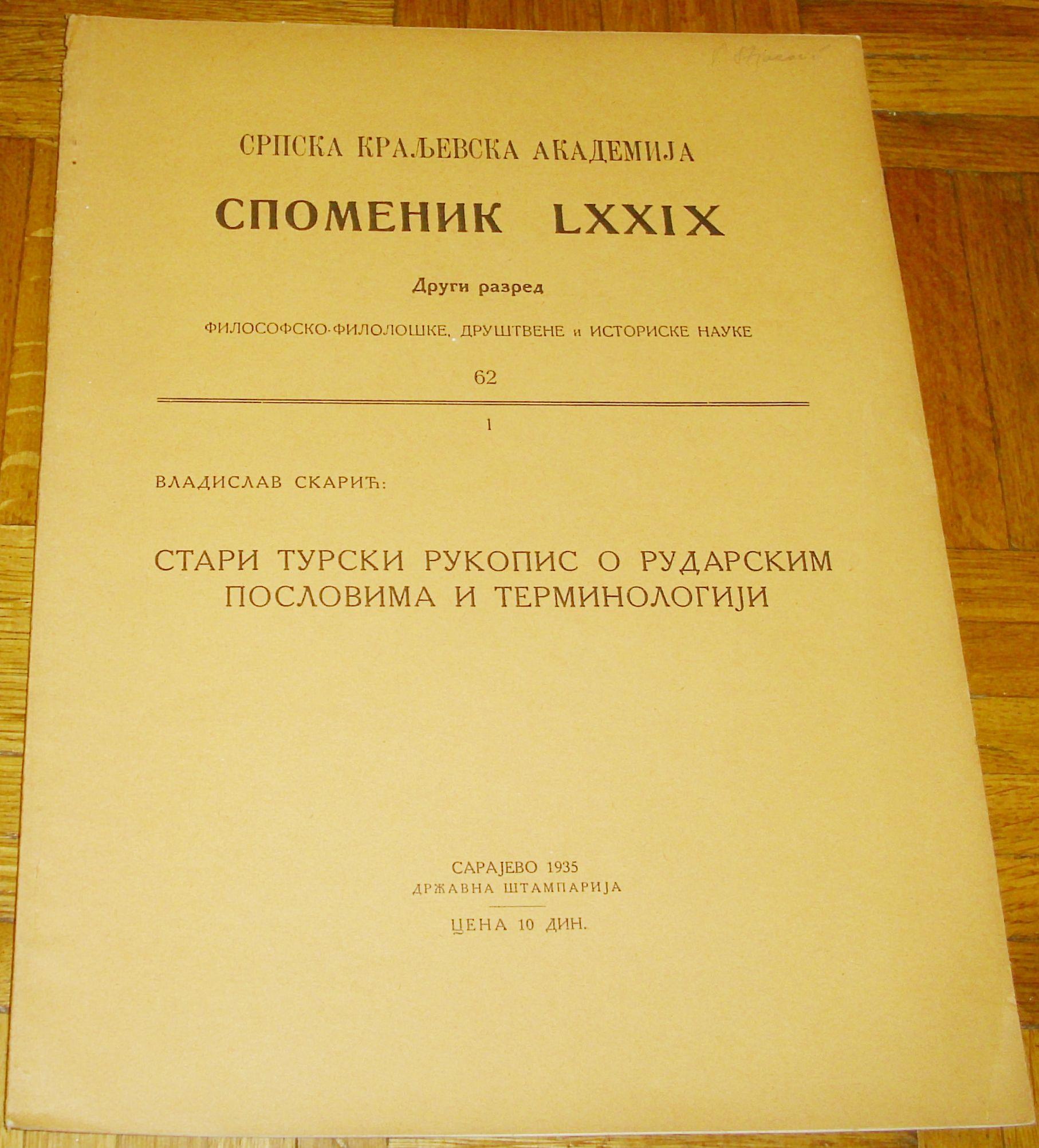 SPOMENIK LXXIX 62 1 : STARI TURSKI RUKOPIS O RUDARSKIM POSLOVIMA I TERMINOLOGIJI