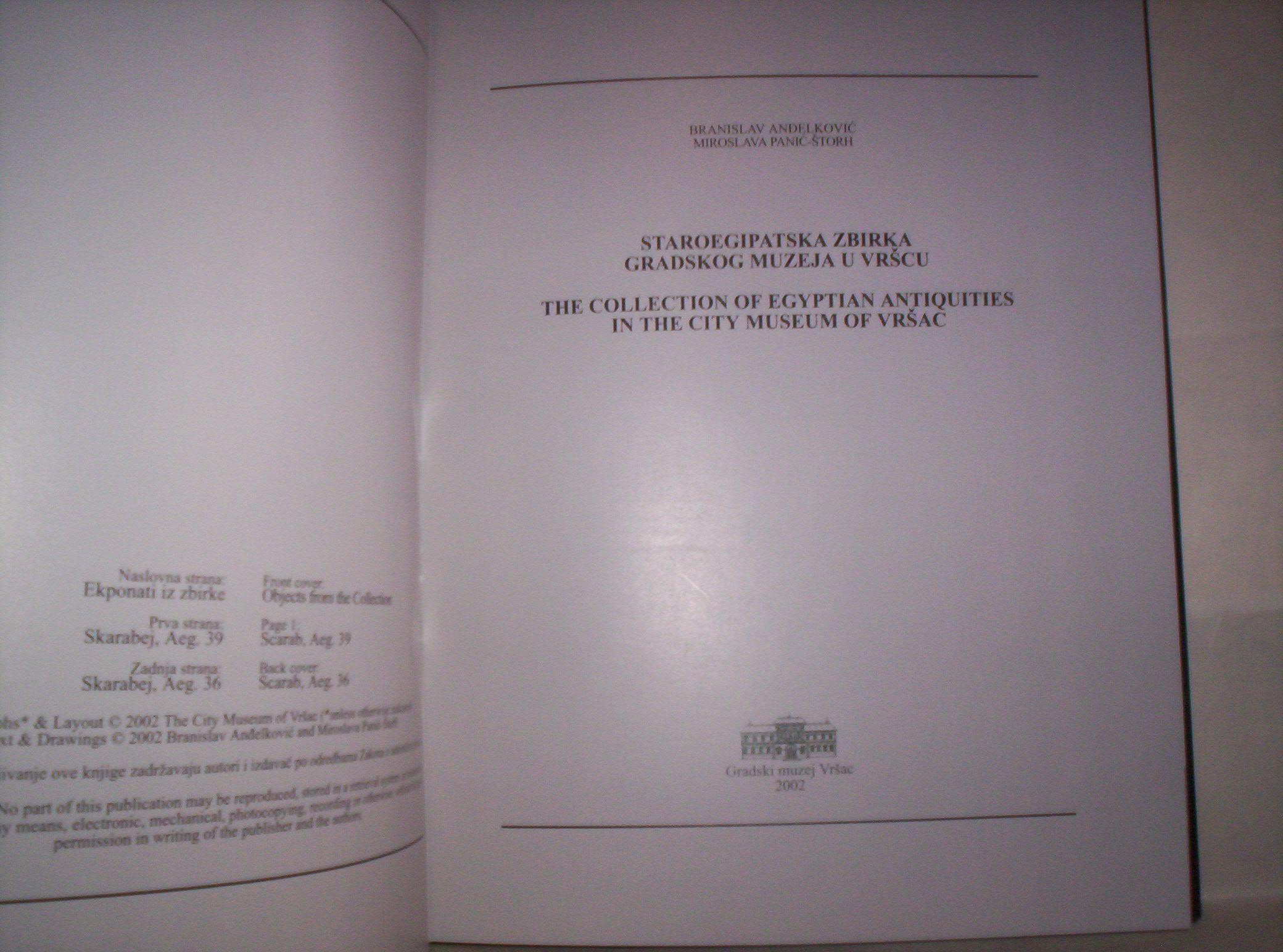 Branislav Anđelković-Miroslava Panić-Štorh: STAROEGIPATSKA ZBIRKA GRADSKOG MUZEJA U VRŠCU, Gradski muzej, Vršac, 2002, format 24 x 30 cm, strana 120, tvrde korice sa zaštitnim omotom, povez šivenjem, zlatotisk. ISBN 86-83911-03-9. Ilustrovano kartama i fotografijama u boji. Dvostubačni uporedni tekst na srpskom i engleskom jeziku. Novo i nekorišćeno. Stranice čiste, bez mrlja i bez podvlačenja redova. Šaljem po uplati. Ne korespondiram SMS porukama. Ne prodajem knjige kupcima sa Kosova i ne šaljem u inostranstvo. Cena je sa poštarinom.