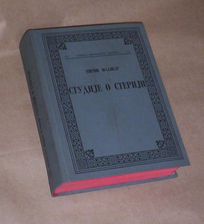 MIRON FLAŠAR: STUDIJE O STERIJI, Srpska književna zadruga, Kolo LXXXI, Knjiga 537, Beograd, 1988, kožni povez, tvrde korice, strana 537, YU ISBN 86-379-0082-8. Knjiga je podeljena na tri osnovne glave. Prva glava Filhelenizam i grčke teme (Grci, Rimljani i Srbi kod Sterije, O Euklionu, Harpagonu i kir-Janji, Sterija prema Molijeru i Plautu, ime i tip tvrdice — o dopunama uz Aululariju, preobličavanje Eukliona u evropskoj komediji, jedna Sterijina reminiacencija na Plauta, karikatura i lokalna boja: grečesko-cincarska mudrost, srebroljublje, kod Sterije i kod antičkih moralista, Kir-Janjin "sioromah Iros"; Druga glava: biografija, roman i antiroman (biograf Sterija, o Sterijinim romanima, načelo mimese i stvaralački plagijat, boj na Kosovu prema baroknom romanu i antičkom epu, teorijske implikacije uvoda u Roman bez romana, protiv herojske epopeje i viteškog romana, parodijska fabula Sterijinog antiromana, osuda klasicističke norme i starije romaneskne fikcije, reminiscencije na Horacija u posveti Romana bez romana; Treća glava: Sterijino Davorje i Horacijeve ode (zatvorena struktura Sterijine zbirke Interpretacije uz Davorje, Variatio kao kompoziciono načelo, pesma Na prirodu (1830) i balada Milan i Bojana, struktura i motivi Sterijine balade, spomen vidova dana, istoriozofske postavke strasti i » beščuvstvije« : na smrt jednog s uma sišavšeg i groblje, Otium divos rogat — u potrazi za spokojstvom, vodnjača — hydrops. Zatim sledi epilog: Davorje na polju Kosovo i beleška o piscu. Knjiga je kao nova, listovi čisti i bez podvlačenja redova. Na koricama vidljivi tragovi ležanja na polici. Šaljem po uplati. Ne korespondiram SMS porukama. Ne prodajem knjige kupcima sa Kosova i ne šaljem u inostranstvo. KUpac plaća poštarinu.