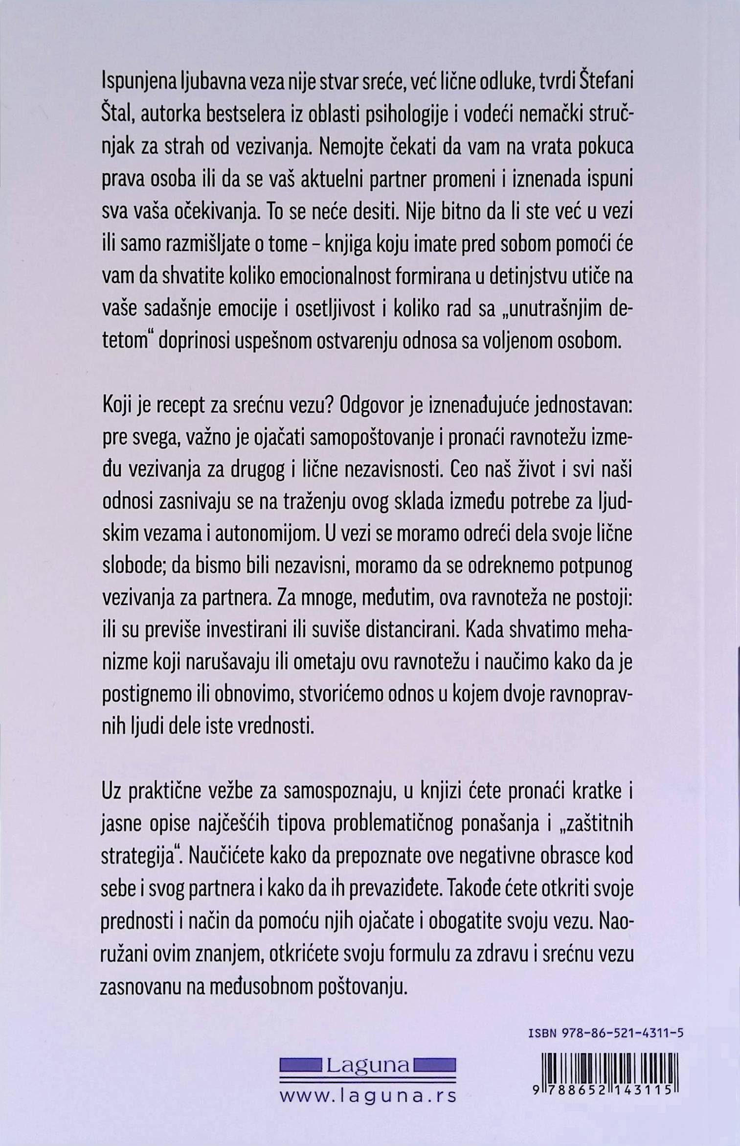 Ispunjena Ijubavna veza nije stvar sreće, već lične odluke, tvrdi Štefani Štal, autorka bestselera iz oblasti psihologije i vodeći nemački stručnjak za strah od vezivanja. Nemojte čekati da vam na vrata pokuca prava osoba ili da se vaš aktuelni partner promeni i iznenada ispuni sva vaša očekivanja. To se neće desiti. Nije bitno da li ste već u vezi ili samo razmišljate o tome knjiga koju imate pred sobom pomoći će vam da shvatite koliko emocionalnost formirana u detinjstvu utiče na vaše sadašnje emocije i osetljivost i koliko rad sa „unutrašnjim detetom" doprinosi uspešnom ostvarenju odnosasavoljenom osobom.